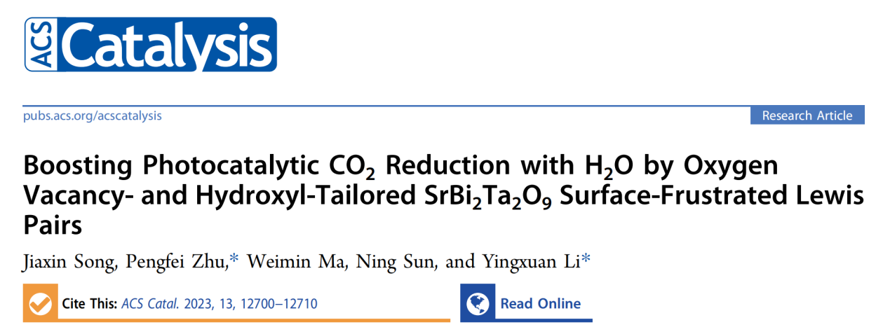 近日,我校環(huán)境科學與工程學院朱鵬飛副教授聯(lián)合哈爾濱工業(yè)大學李英宣教授在國際催化領域頂級期刊《ACSCatalysis》(IF=12.9,中科院一區(qū))上發(fā)表題為“Boosting Photocatalytic CO2Reduction with H2O by Oxygen Vacancies and Hydroxyls Tailored SrBi2Ta2O9Surface Frustrated Lewis Pairs”的研究論文。該研究通過在SrBi2Ta2O9(SBT)表面成功構筑受阻Lewis酸堿對(FLPs),利用氧空位(VO)和表面羥基(-OH)分別作為Lewis酸位點和Lewis堿位點,有效地提高了SBT對CO2的吸附和活化能力,合成的VO-SBT-OH催化劑在沒有任何犧牲劑和助催化劑的情況下用純水將CO2高效還原為CO,達到了反應60小時的穩(wěn)定性。我校為論文的第一通訊單位,碩士生宋佳欣為第一作者,朱鵬飛副教授和李英宣教授為通訊作者。