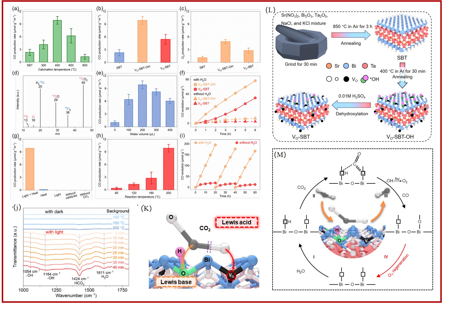 利用太陽能驅動還原CO2為高附加值化學品受到了廣泛關注和研究。對于光催化還原CO2過程,CO2在催化劑表面的吸附與活化是實現(xiàn)CO2高效光催化還原的關鍵因素。但線性CO2分子的高穩(wěn)定性和C=O鍵的高鍵能(806 kJ mol?1)嚴重阻礙了這一過程。研究表明,在氫氧化物上構建FLPs可以促進CO2在催化劑表面的吸附與活化,顯著提高CO2還原性能。但是,由于缺乏表面羥基,在高惰性金屬氧化物上裁剪FLPs仍然是一個嚴峻的挑戰(zhàn)。此外,氧空位與羥基在CO2還原過程中的協(xié)同作用需要進一步探究。本工作提出了具有FLPs的VO-SBT-OH光催化CO2還原的機理。(Ⅰ)H2O在光熱條件下被解離為羥基并吸附在SBT表面,表面羥基和臨近的氧空位形成了FLPs。(Ⅱ)所形成的FLPs通過強相互作用與CO2分子結合,形成了含碳中間體HCO3-。(Ⅲ)在光熱條件下,CO2的C=O鍵斷裂,羥基被空穴氧化為O2,CO被釋放出來。(IV)反應過程中消耗的氧空位通過退火重新引入,而羥基則在H2O的存在下原位補充,實現(xiàn)長期穩(wěn)定的CO2還原。本研究結果為開發(fā)高效CO2還原光催化劑,將太陽能轉化為化學能提供了一條新途徑。