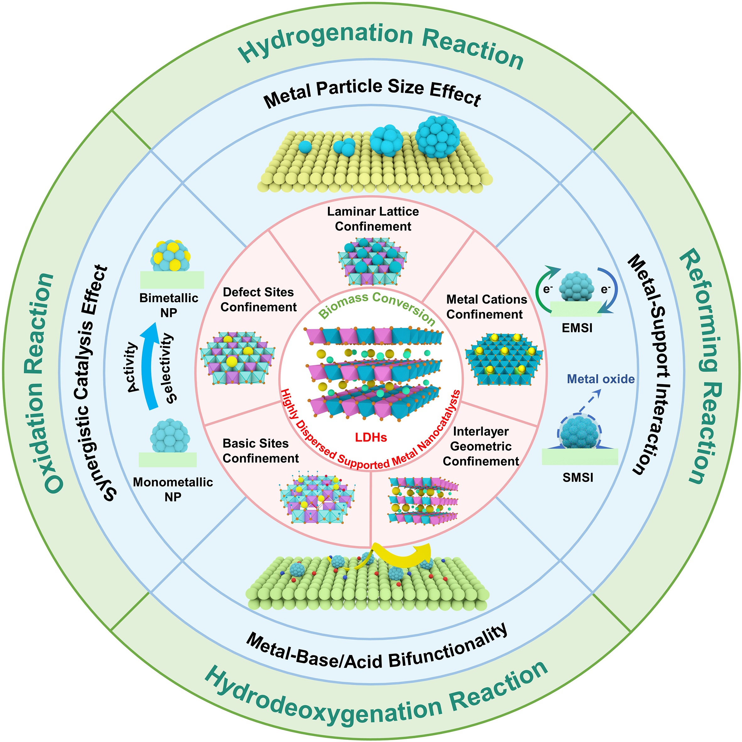 精準調控負載型納米金屬催化劑的表面微環境包括幾何配位環境和金屬活性中心的電子態,特別是對于高分散的單原子(SAs)、納米團簇(NCs)和納米顆粒(NPs),是生物質催化轉化制備高附加值燃料和化學品領域的研究熱點。層狀雙氫氧化物(LDHs)由于其層板構成金屬組分在原子水平均勻分布、豐富的化學組成、獨特的限域效應和結構拓撲轉變性質,是獲得具有特定表面微環境的高分散納米金屬催化劑的理想結構平臺。基于此,本文根據LDHs前驅體獨特的結構性質和催化活性金屬組分的種類不同,從全新的視角歸納了LDHs基高分散納米金屬催化劑(包括SAs、NCs和NPs)的限域合成策略;重點強調和總結了LDHs基納米金屬催化生物質轉化反應體系存在的微環境效應;全面綜述了LDHs基納米金屬催化劑在生物質催化還原、氧化和重整反應中的應用,對各類納米金屬催化劑在生物質催化轉化過程中的構效關系和反應機理進行深入分析和思考;最后,詳細探討和展望了該領域目前面臨的挑戰和未來發展機遇。