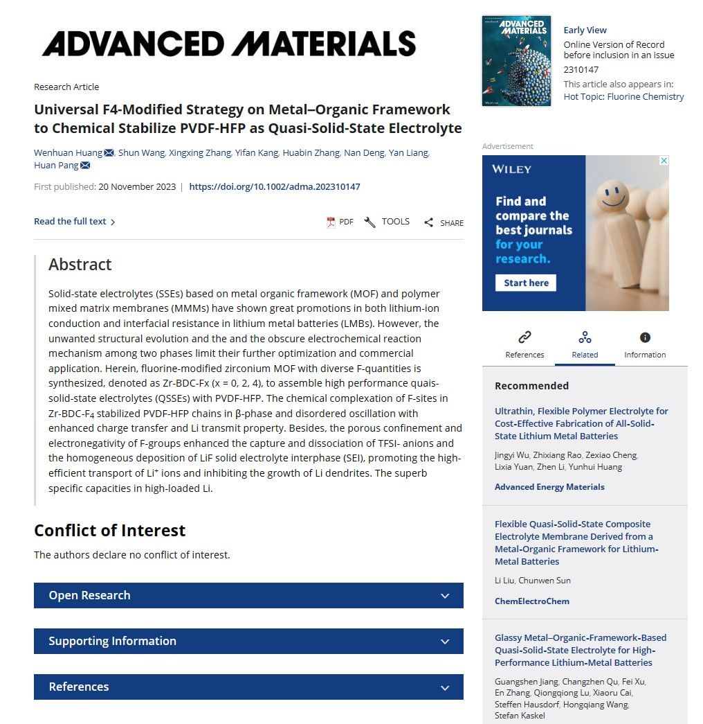 (1)W. Huang*, S. Wang, X. Zhang, Y. Kang, H. Zhang*, N. Deng, Y. Liang, H. Pang*, Universal F4-modified Strategy on Metal Organic Framework to Chemical Stabilize PVDF-HFP as Quasi-Solid-State Electrolyte, Advanced Materials, DOI: 10.1002/adma.202310147. (2022影響因子:29.4)