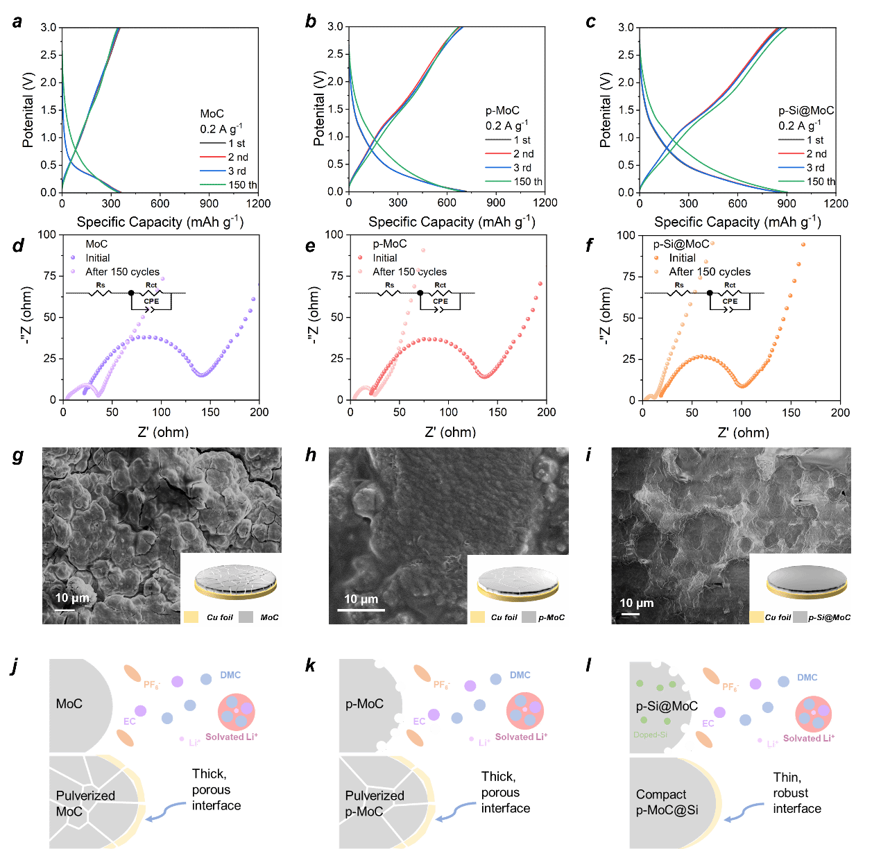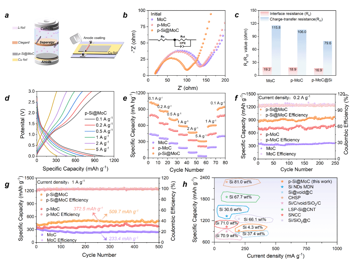 作為鋰離子電池負(fù)極材料,p-Si@MoC展現(xiàn)出了極小的電極/電解質(zhì)界面阻抗(Rs)和電荷轉(zhuǎn)移阻抗(Rct)。值得注意的是,優(yōu)化后p-Si@MoC負(fù)極在250次循環(huán)后顯示976.6 mAh g-1的放電容量,而p-MoC在250次循環(huán)后的放電容量為800.6 mAh g-1。根據(jù)p-Si@MoC中Si的含量(4.3 wt%)計(jì)算出硅的理論容量為180.6 mAh g-1。因此,我們認(rèn)為這種獨(dú)特的多孔結(jié)構(gòu)可以最大限度地利用Si摻雜來提高容量,且Si的容量利用率可達(dá)97.5%。