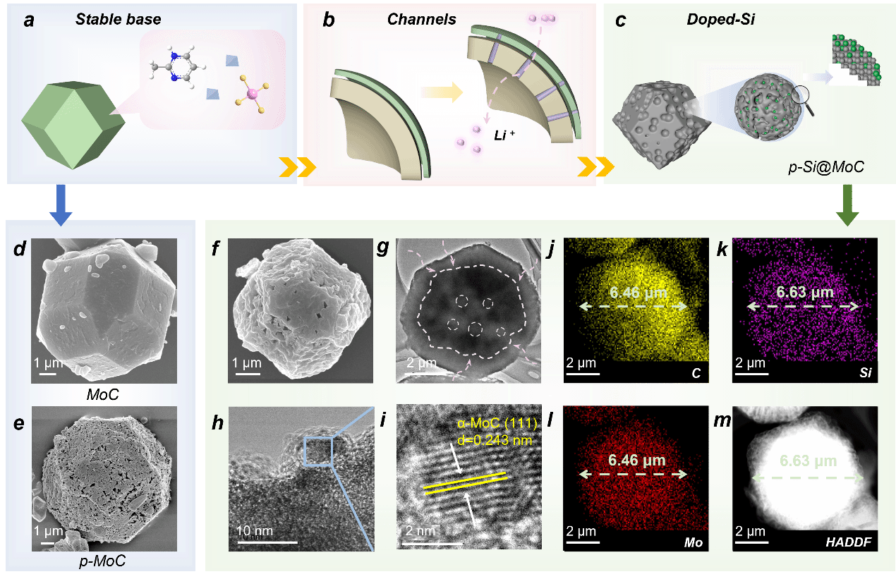 鑒于此,黃文歡教授團(tuán)隊(duì),采用ZnMo雙金屬雜化沸石咪唑酸鹽框架(HZIF-ZnMo),開發(fā)和設(shè)計(jì)了一種超低4.3 wt%的硅摻雜多孔MoC材料,并進(jìn)一步探索了其在高容量鋰離子電池中的潛力(在0.2 A g?1下進(jìn)行250次循環(huán)后,容量為976.6 mAh g?1)。研究表明,多孔MoC作為基底,不僅為鋰離子的快速擴(kuò)散提供了連續(xù)的通道,還使超低含量的硅在多孔基體中高度均勻分布,有效誘導(dǎo)硅在循環(huán)過程中實(shí)現(xiàn)自身容量的最大利用,研究成果發(fā)表于學(xué)術(shù)期刊Advanced Functional Materials,題為“Ultra-Low 4.3 wt% Silicon Thermal Reducing Doped Porous Si@MoC as Highly Capable and Stable Li-Ion Battery Anode”