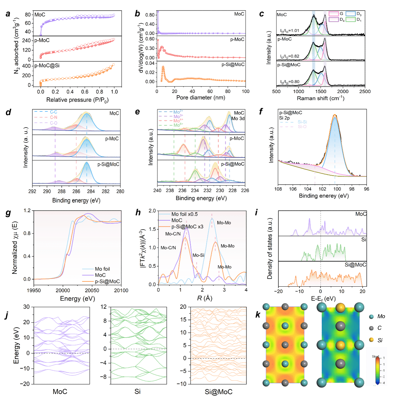 通過X射線近邊吸收光譜(XANES)和擴(kuò)展X射線吸收精細(xì)結(jié)構(gòu)譜(EXAFS),驗(yàn)證了Si摻雜在MoC基體中形成的Mo-Si鍵。通過密度泛函理論(DFT)的計(jì)算,揭示了多孔Si@MoC優(yōu)異的電導(dǎo)率和電子傳遞能力。