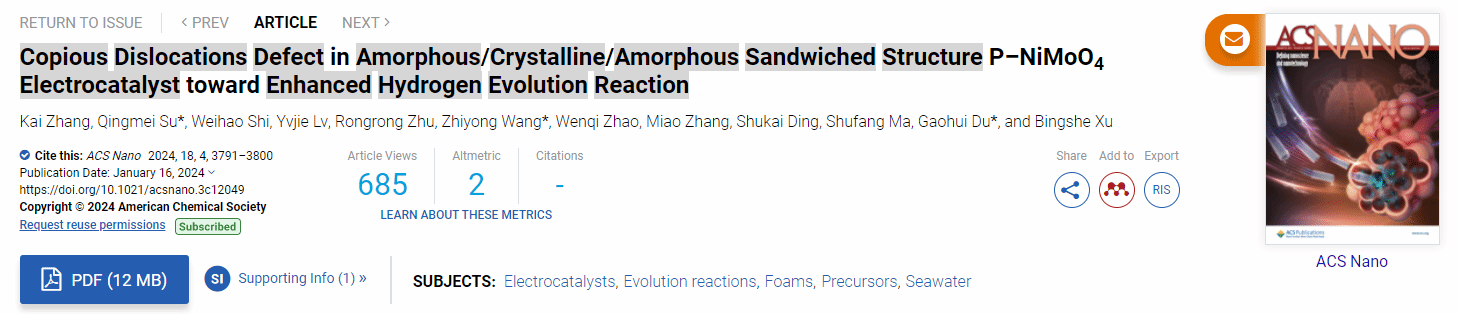 近日,我校物理與信息科學學院許并社教授團隊在電催化制氫領域取得重要進展,相關成果以“Copious dislocations defect in amorphous/crystalline/amorphous sandwiched structure P-NiMoO4 electrocatalyst towards enhanced hydrogen evolution reaction”為題,發表在國際頂級期刊ACS Nano(影響因子17.1)上。我校博士研究生張凱為第一作者,蘇慶梅教授、王智勇教授和杜高輝教授為共同通訊作者,陜西科技大學為唯一通訊作者單位。