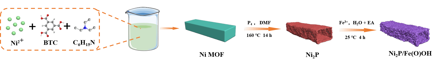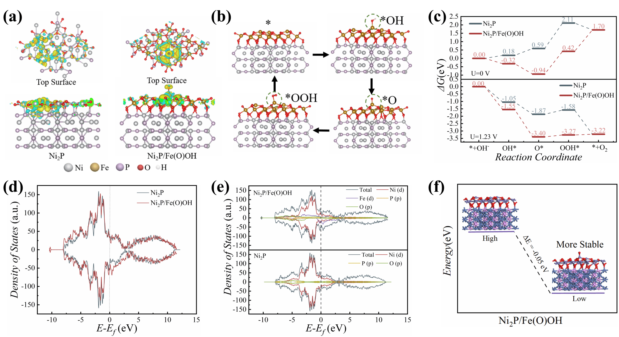 隨著人們對(duì)化石燃料過度消費(fèi)導(dǎo)致環(huán)境問題的日益關(guān)注,氫作為能源載體成為最有希望的替代能源。水電解制氫被認(rèn)為是大規(guī)模獲得高純氫氣最適用的技術(shù)。然而,陽(yáng)極析氧反應(yīng)(OER)是一個(gè)復(fù)雜且動(dòng)力學(xué)緩慢的四電子轉(zhuǎn)移過程,長(zhǎng)期以來一直是水電解的主要瓶頸。富金屬磷化鎳相具有高導(dǎo)電性和豐富的電催化位點(diǎn),可在堿性溶液中有效催化OER。然而,如何有效地增加電催化活性位點(diǎn)的數(shù)量,降低羥基(ΔGOH*)在Ni位點(diǎn)的吸附能,進(jìn)一步提高電催化OER活性仍是一個(gè)挑戰(zhàn)。Fe(O)OH環(huán)保且成本低,但其電催化OER活性較差,受限于Fe位點(diǎn)上的低電導(dǎo)率和羥基吸附較弱。然而,F(xiàn)e位點(diǎn)上的弱吸附使得調(diào)節(jié)相鄰Ni位點(diǎn)上氧合物質(zhì)的吸附能成為理想選擇,形成異質(zhì)結(jié)構(gòu)可以增強(qiáng)表面親水性,改變表面活性位點(diǎn)的電子結(jié)構(gòu)和化學(xué)環(huán)境,改變界面雙層結(jié)構(gòu),中斷界面水偶極子排列。這些因素可導(dǎo)致OER催化活性增強(qiáng)。因此,Ni2P/Fe(O)OH異質(zhì)結(jié)構(gòu)有望實(shí)現(xiàn)高效的電催化OER活性,對(duì)未來水電解制氫的廣泛應(yīng)用至關(guān)重要。