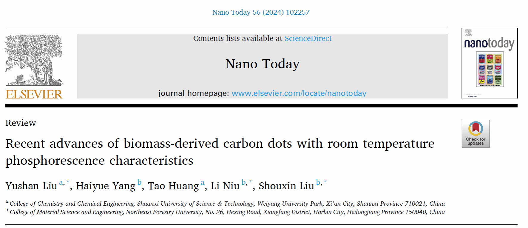 近日,我校化學(xué)與化工學(xué)院青年教師劉禹杉在國(guó)際高水平期刊《Nano Today》(影響因子:17.4)上發(fā)表題為“Recent advances of biomass-derived carbon dots with room temperature phosphorescence characteristics”的綜述型論文。我校青年教師劉禹杉為論文第一作者,東北林業(yè)大學(xué)劉守新教授及牛力博士為共同通訊作者,陜西科技大學(xué)為第一通訊單位,該論文的發(fā)表極大地提高了我校在生物質(zhì)室溫磷光碳點(diǎn)領(lǐng)域的國(guó)際影響力。
