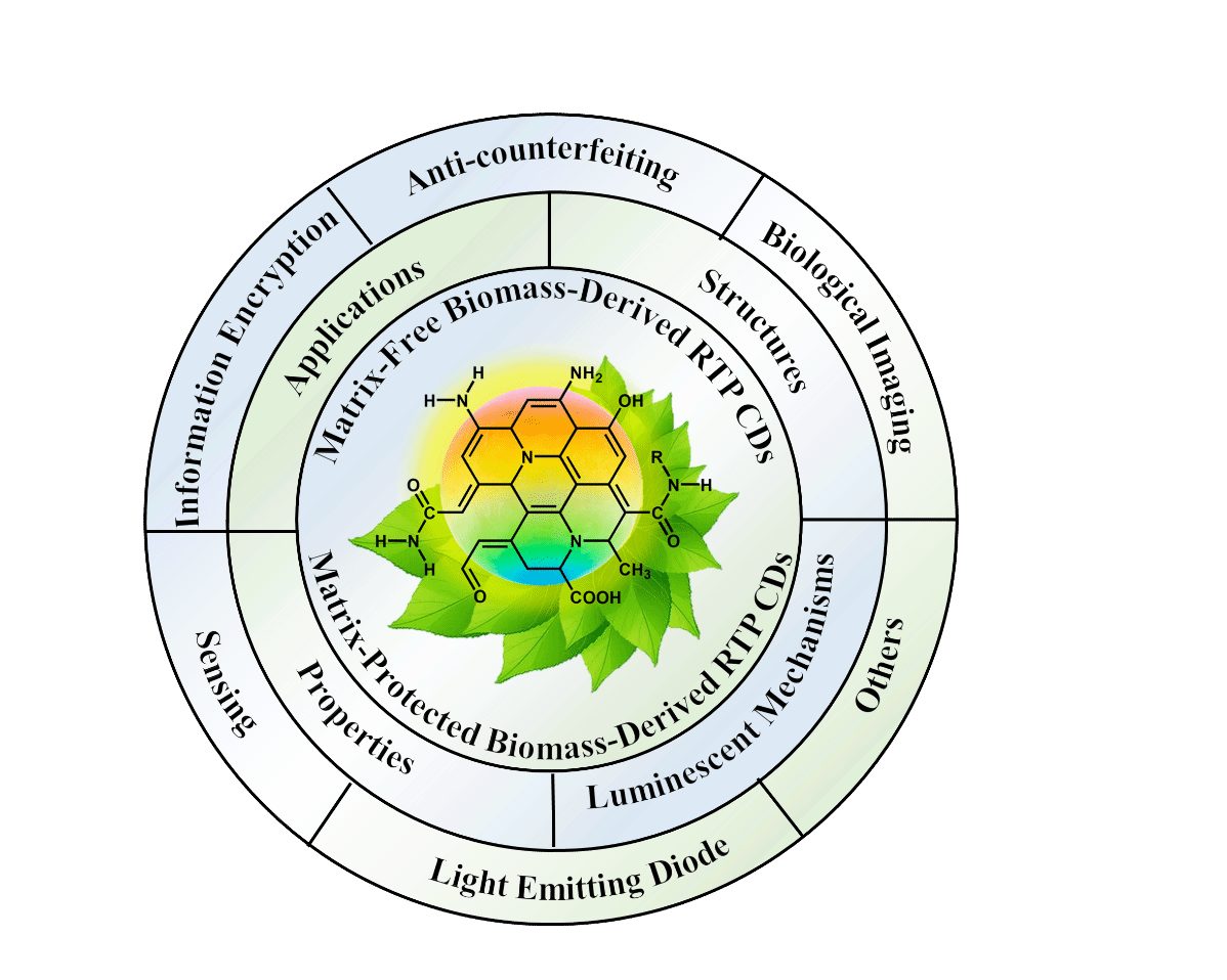 室溫磷光材料由于在室溫下有著相對(duì)較長(zhǎng)的余輝時(shí)間,在防偽加密、數(shù)據(jù)存儲(chǔ)、光電器件、生物成像等諸多方面顯示出日益增長(zhǎng)的重要作用。目前報(bào)道的室溫磷光材料較少且局限于有機(jī)金屬配合物和純有機(jī)化合物。然而,這些材料一直飽受合成成本高、生物毒性大及制備方法復(fù)雜等詬病,極大地限制了應(yīng)用。相比之下,碳點(diǎn)的合成簡(jiǎn)便、成本低廉、生物相容性高、光穩(wěn)定性強(qiáng),尤其是表現(xiàn)出更多樣化的結(jié)構(gòu)設(shè)計(jì)和更好的發(fā)光可調(diào)諧性,有望成為下一代室溫磷光材料的主力軍之一。然而,當(dāng)前室溫磷光碳點(diǎn)大多以有機(jī)化學(xué)品為原料合成,長(zhǎng)此以往勢(shì)必會(huì)加劇資源消耗,危害生態(tài)環(huán)境。因此,迫切需要尋找可再生的替代物制備室溫磷光碳點(diǎn)。生物質(zhì)作為自然界中儲(chǔ)量豐富的可再生資源,具有天然芳香結(jié)構(gòu)和較多的羥基、羧基、氨基基團(tuán),在構(gòu)筑室溫磷光碳點(diǎn)中具有應(yīng)用潛力。其雜原子自摻雜性能也有利于構(gòu)筑碳點(diǎn)的共軛碳核及室溫磷光活性位點(diǎn)(C=O/C=N)。此外,生物質(zhì)室溫磷光碳點(diǎn)還解決了生物廢棄物的利用問題,降低了生產(chǎn)成本,實(shí)現(xiàn)了碳的可持續(xù)發(fā)展。盡管,生物質(zhì)碳點(diǎn)的室溫磷光特性目前已經(jīng)取得了重大研究進(jìn)展,但尚未發(fā)表任何綜述型論文對(duì)其進(jìn)行系統(tǒng)地總結(jié)。