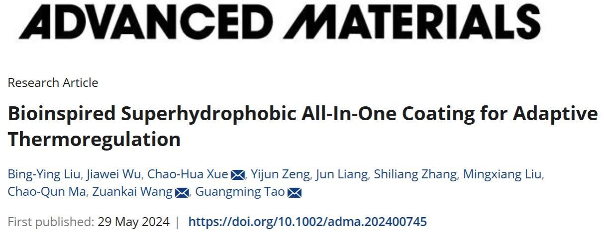 近日,輕工科學與工程學院薛朝華教授團隊聯合香港理工大學王鉆開教授和華中科技大學陶光明教授團隊,在國際TOP期刊《Advanced Materials》(IF:29.4)上發表了題為“Bioinspired Superhydrophobic All-in-one Coating for Adaptive Thermoregulation”的研究論文。我校薛朝華教授、香港理工大學王鉆開教授和華中科技大學陶光明教授為文章共同通訊作者,輕工學院博士后柳冰瑩和華中科技大學博士生吳嘉威為文章共同一作,陜西科技大學為第一通訊單位。