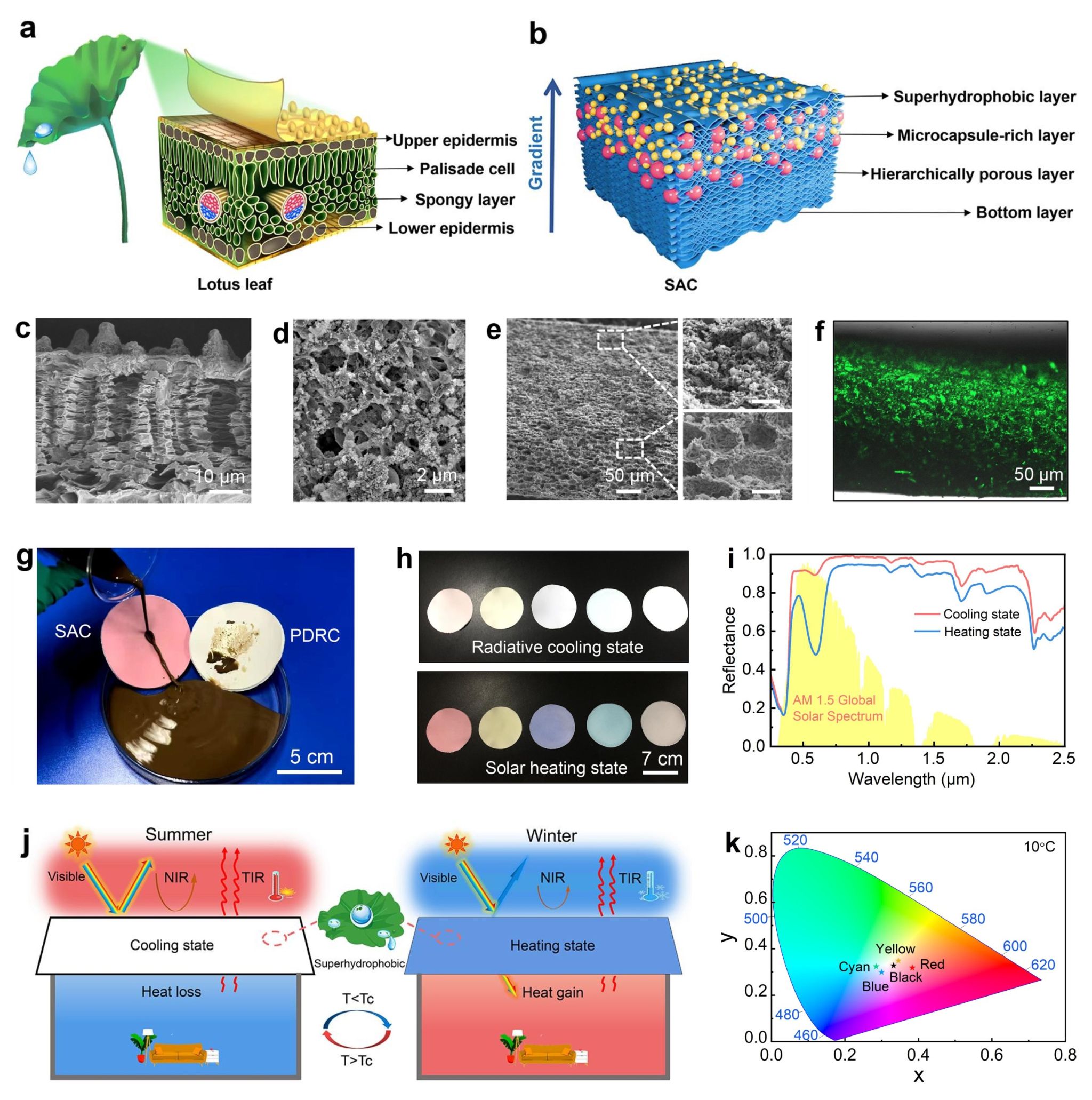 鑒于此,陜西科技大學薛朝華教授團隊聯合香港理工大學王鉆開教授和華中科技大學陶光明教授團隊合作研究,受荷葉的縱向梯度特征和表面微納結構的啟發,通過一步相分離工藝制備出了一種集超疏水表面自清潔、太陽光反射率自動可調和熱紅外發射有效利用于一體的多功能調溫涂層,實現了高溫環境下的輻射降溫和低溫環境下的太陽能加熱從而達到“冬暖夏涼”智能調溫。