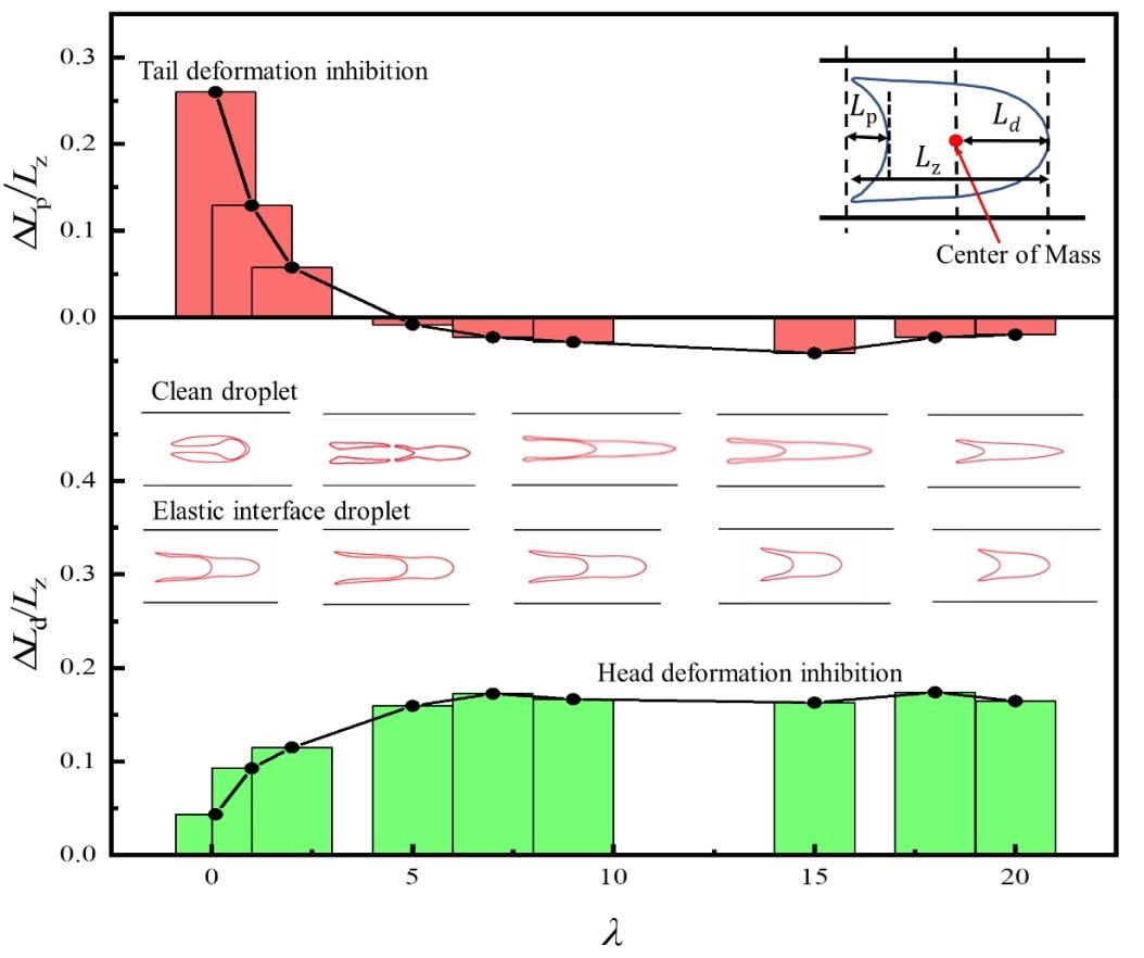 儲層孔隙中油水界面力學(xué)特性:在納米顆粒表活劑吸附下,油水界面會呈現(xiàn)與界面張力顯著不同的界面粘彈性,發(fā)展了能夠考慮油水界面粘彈性的界面力學(xué)模型并與計算流體力學(xué)方法耦合,揭示了儲層孔隙中納米顆粒表活劑吸附下液滴運移過程中的變形動力學(xué)機制。