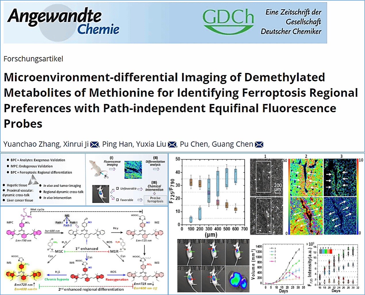 近日,我校化學與化工學院陳光教授課題組在新型熒光分子開發方面取得重要進展,相關研究成果以“Microenvironment-differential Imaging of Demethylated Metabolites of Methionine for Identifying Ferroptosis Regional Preferences with Path-independent Equifinal Fluorescence Probes”為題發表在《Angew. Chem.》(自然指數期刊,綜合性1區TOP期刊),我校為第一通訊單位,化學與化工學院博士生張遠超為第一作者,陳光教授為通訊作者,加拿大滑鐵盧大學的Xinrui Ji研究員及我校劉玉霞副教授為共同通訊作者。國家自然科學基金面上項目(22174090)提供經費支持。該研究的發表極大地推進了我校在相關學科領域的影響力。