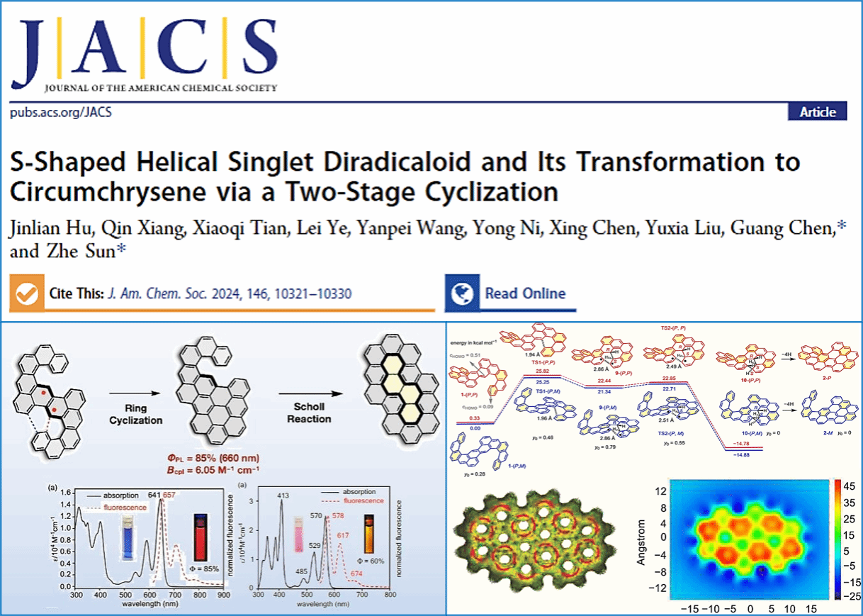 此外,為開發新型熒光分子,陳光教授課題組與天津大學孫哲教授課題組聯合研究了利用單線態雙自由基關環反應合成高量子產率大環熒光母體。相關研究成果以“S-Shaped Helical Singlet Diradicaloid and Its Transformation to Circumchrysene via a Two-Stage Cyclization”為題發表在《Journal of the American Chemical Society》(自然指數期刊,綜合性1區TOP期刊),我校為第二通訊單位,陳光教授為共同通訊作者。文中設計并合成了具有單線態雙自由基基態的S形雙重螺烯化合物。該化合物的雙自由基性質,降低了熱激發電環化反應的反應能壘,使得其可在螺烯位置快速高效地進行級聯電環化反應構建兩個C-C鍵,并在氧化劑存在的情況下實現脫氫得到共軛延展的螺烯化合物。最后作者利用Scholl反應實現了關環反應,得到了環屈化合物,其性質穩定、熒光量子產率高,對于后續開發高亮度熒光分子并用于腫瘤切除手術導航等領域具有重要參考價值。