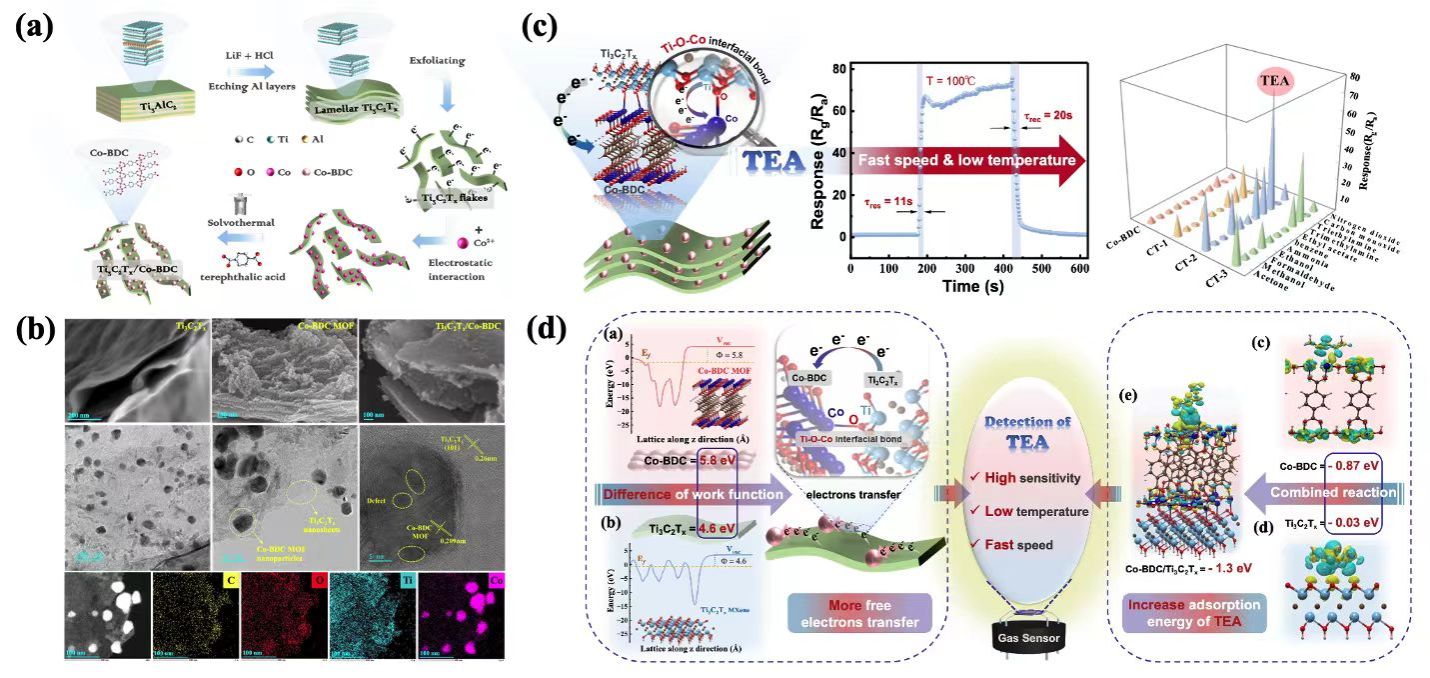 針對以上技術問題,我校陳慶彩教授團隊開發出一種基于MXene復合材料的新型氣體傳感器,實現了對有機胺氣體的超靈敏檢測。并且該傳感器工作穩定能夠在低于100攝氏度條件下,顯著提高了傳感器在易燃易爆環境中的安全性與適用性。該傳感器采用類金屬MXene作為修飾材料,將響應時間和恢復時間平均縮短至15秒,達到了亞分鐘級的快速檢測。通過理論模擬發現,這一技術傳感器性能的提升機制在于MXene和MOFs之間Ti-O-Co界面鍵的形成,該界面鍵不僅提高了傳感器材料的載流子遷移率,還增強了對有機胺分子的吸附能,有效提升了傳感器的綜合檢測性能。該傳感器可以為易燃易爆區域的空氣質量監測提供了安全、高效、便攜、低成本的解決方案,保障工業安全生產和社會人類健康。目前,該項技術也已經獲得了國家發明專利授權。