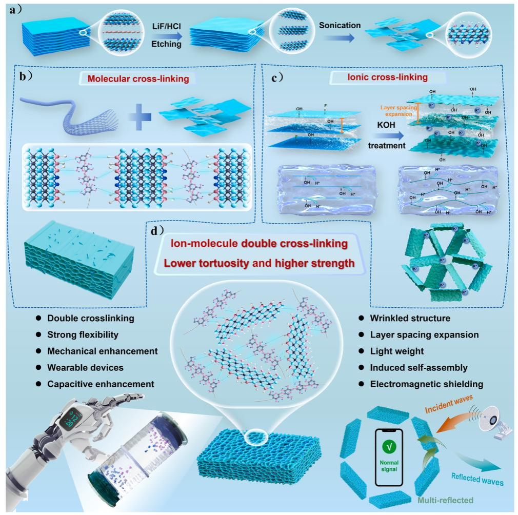 不同比例的分子交聯與離子分子雙交聯多孔MXene膜力學性能及力學提升機理圖