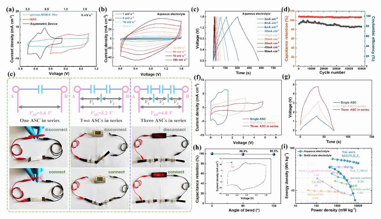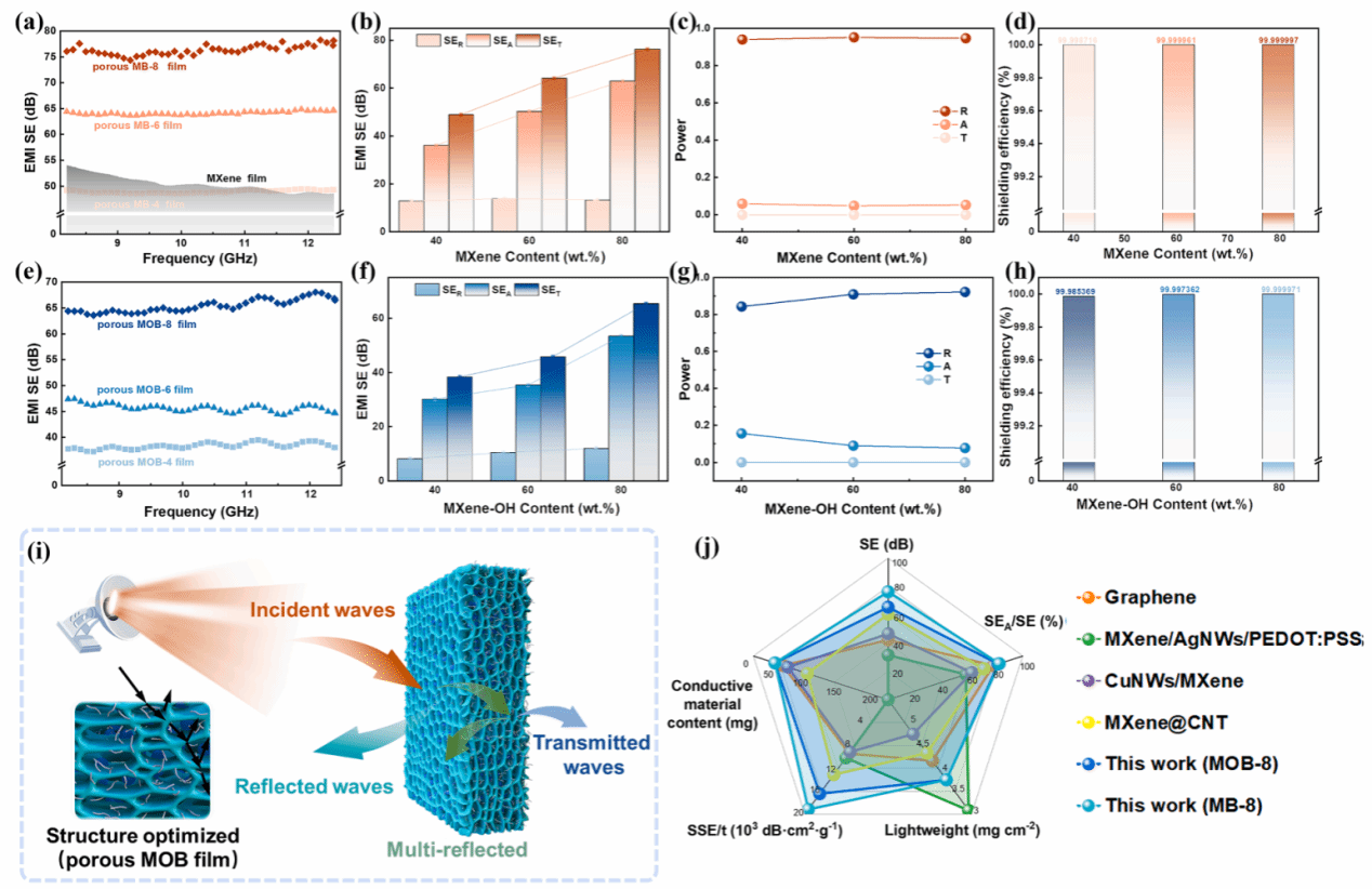 文章亮點如下:通過離子分子雙交聯體系和隨后的冷凍干燥工藝,構筑了在橫向和垂直方向都具有三維網狀多孔的結構,這一獨特結構極大縮短了離子的傳遞速率,纖維與納米片之間的高度互連性也提高了多孔膜的力學性能及電磁屏蔽性能;離子交聯通過庫侖吸引調整MXene片層的方向,同時優化的終端和離子插層擴大了層間距;分子交聯通過氫鍵相互作用調整多孔結構的骨架;具有互連性的多孔MXene-OH/BC膜同時表現出優異電化學性能和電磁屏蔽性能,提供了527 F/g的電容,41.5 MPa的機械強度,分別為MXene薄膜的140%和367%,并表現出67.2 dB的電磁屏蔽效能。