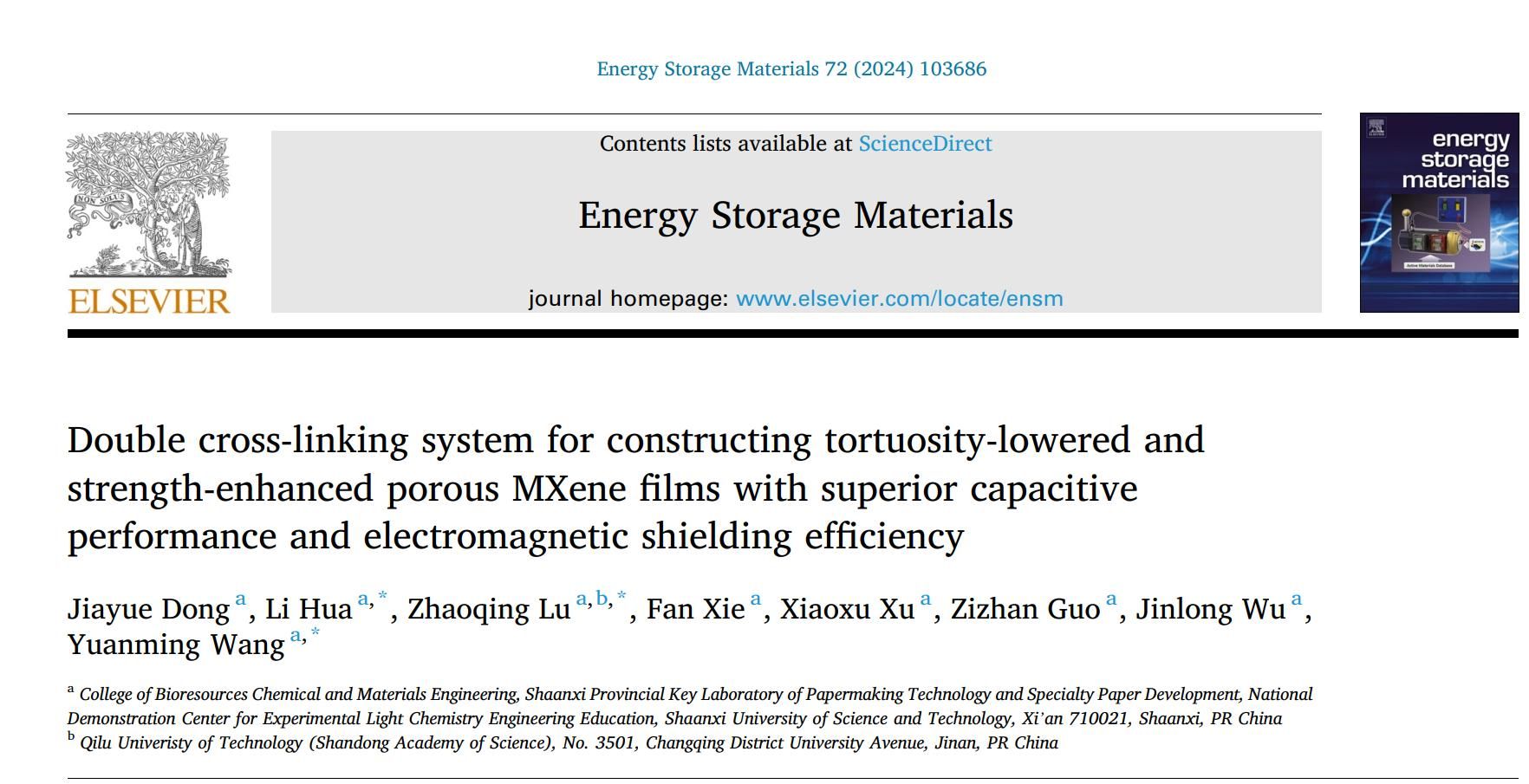 為了解決上述問題,陜西科技大學陸趙情教授團隊通過離子分子雙交聯體系設計和凍干干燥工藝,構建了具有低曲率和高強度的三維結構的柔性多孔MXene薄膜材料。該項工作從材料的的表面終端基團、層間距和定向結構角度優化了多孔材料的物理化學性質,并為制備輕質高強的柔性儲能材料和電磁屏蔽材料提供了新思路。相關工作在《Energy Storage Materials》(IF:18.9)以“Double cross-linking system for constructing tortuosity-lowered and strength-enhanced porous MXene films with superior capacitive performance and electromagnetic shielding efficiency”為題發表。