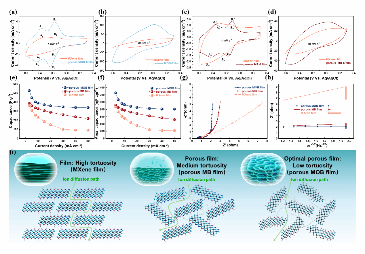 多孔MXene薄膜因其多樣的孔隙結構和豐富的表面化學性質,成為理想的柔性電子材料,在柔性儲能、電磁屏蔽等應用方面潛力巨大。然而,其典型的問題,特別是作為柔性儲能材料時,在高電流密度下,電容性能急劇下降。主要原因在于層間結合致密,阻礙了離子的動態擴散,此外,離子擴散路徑的曲率過高,電荷傳輸過程緩慢。目前研究者致力于研發兼具大比表面積、低曲率以及優良導電性和機械性能的多孔MXene薄膜,但仍然面臨諸多挑戰。