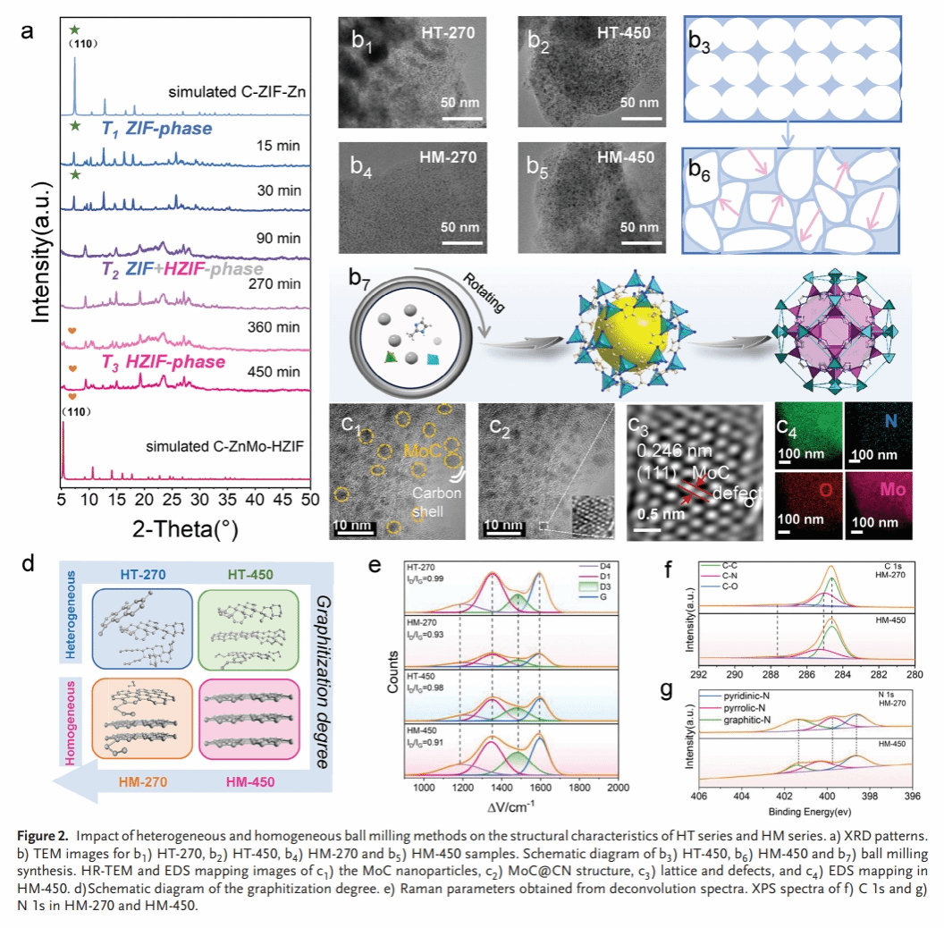 為了解決上述問(wèn)題,陜西科技大學(xué)黃文歡教授團(tuán)隊(duì)開發(fā)出了一種簡(jiǎn)便且可擴(kuò)展實(shí)施的策略,即利用ZnMo-HZIF材料,通過(guò)球磨發(fā)泡和高溫煅燒工藝,成功構(gòu)建出多氮摻雜的MoC/NC三維泡沫結(jié)構(gòu)復(fù)合材料。這項(xiàng)工作提出了關(guān)于結(jié)構(gòu)和組分對(duì)電磁波吸收性能協(xié)同效應(yīng)的新視角,并為制備輕質(zhì)高性能MOF基電磁波吸收材料提供了新方法。相關(guān)工作在《Advanced Functional Materials》期刊上以“In situ Mechanical Foaming of Hierarchical Porous MoC for Assembling Ultra-light, Self-cleaning, Heat-insulation, Flame-retardant, and Infrared-stealth Device”為題發(fā)表。