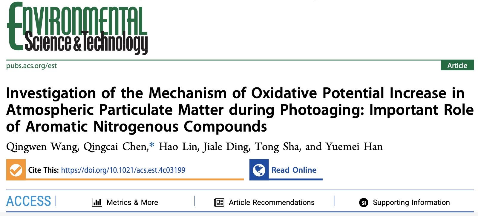 近日,環境學院陳慶彩教授團隊關于大氣污染健康風險的研究成果,在大氣領域頂級期刊《Environmental Science & Technology》(中科院一區TOP,自然指數期刊)上發表,題目為“Investigation of the mechanism of oxidative potential increase in atmospheric particulate matter during photoaging: important role of aromatic nitrogenous compounds”。陳慶彩教授為唯一通訊作者,碩士研究生王擎雯為第一作者,陜西科技大學為第一單位和唯一通訊單位。