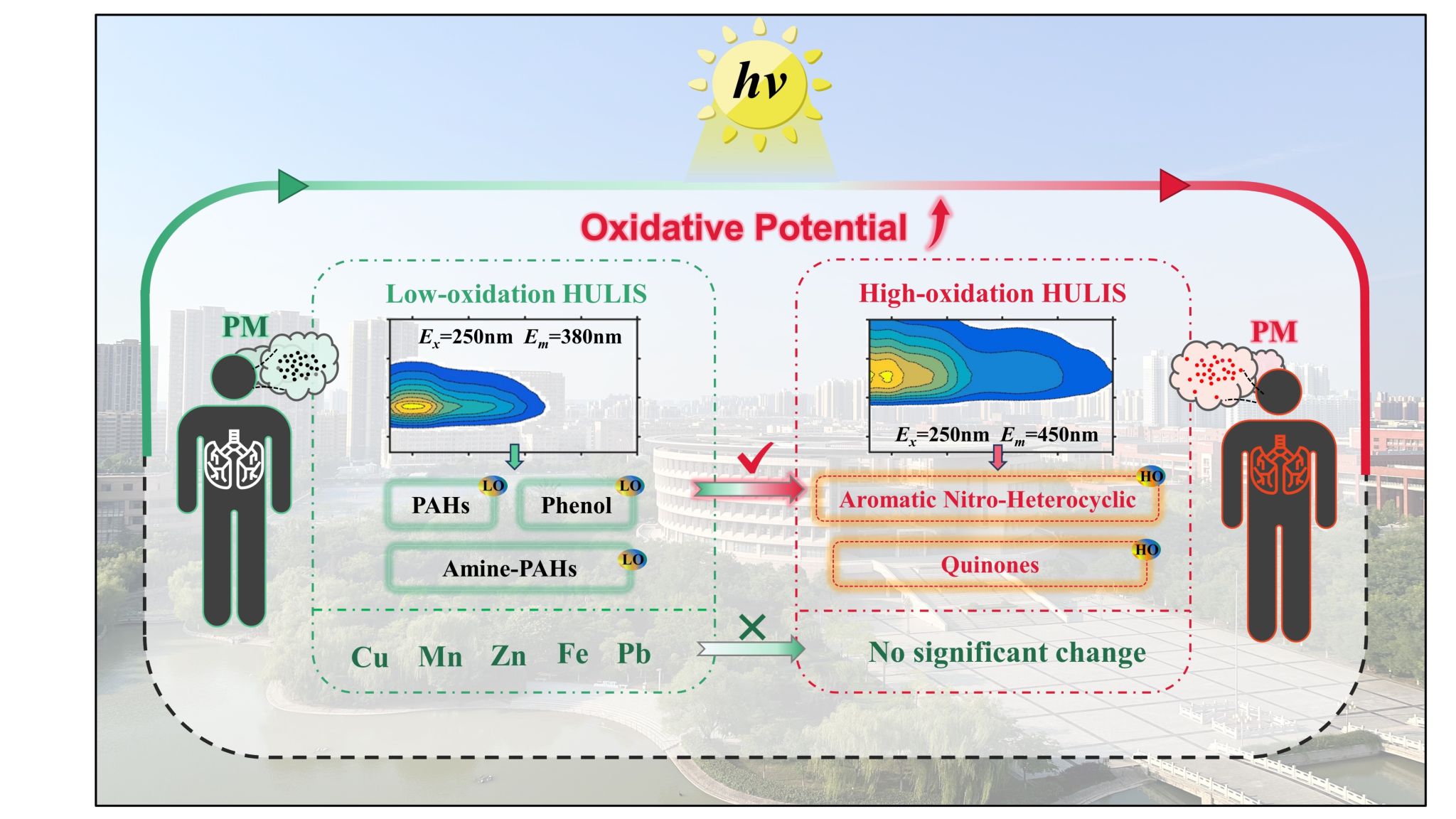 研究發現太陽光照可以使大氣顆粒物的氧化毒性顯著增強,證實了自然因素對大氣顆粒物健康風險的影響事實。經過化學分析和機制探討,發現大氣顆粒物毒性增加主要是由于光照引發二次有機毒性分子和持久性自由基的生成。其中,醌類分子是產生二次氧化毒性最主要原因,硝基酚類化合物和含氮雜環化合物發揮了催化作用,促進了新的氧化毒性化合物生成和催化產生活性氧自由基的產生。這一發現揭示了太陽光照條件下大氣顆粒物毒性變化的關鍵驅動因素和分子機制,不僅豐富了大氣顆粒物在實際環境中毒性變化的科學理論,還為應對環境污染與健康風險提供了新的認知和方法指導。