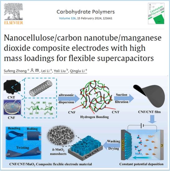同時,研究了一種通過電化學沉積高質量二氧化錳(MnO2)到納米纖維素(CNF)和碳納米管(CNT)導電膜表面的方法來構建具有高電容和機械性能的柔性復合電極材料。相關研究成果以“Nanocellulose/carbon nanotube/manganese dioxide composite electrodes with high mass loadings for flexible supercapacitors”為題發表國際期刊Carbohydrate Polymers(文章鏈接:https://doi.org/10.1016/j.carbpol.2023.121661)。