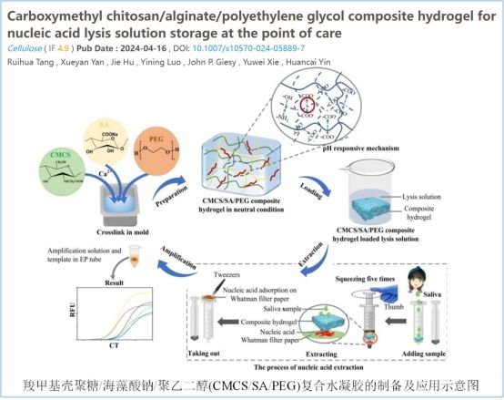 本課題組唐蕊華副教授在紙基傳感器檢測研究方面取得一定進展,相關成果以“Carboxymethyl chitosan/alginate/polyethylene glycol composite hydrogel for nucleic acid lysis solution storage at the point of care”為題發表在Cellulose期刊(文章鏈接:https://doi.org/10.1007/s10570-024-05889-7)。本研究通過物理交聯的方法研發了一種pH響應的羧甲基殼聚糖/海藻酸鈉/聚乙二醇(CMCS/SA/PEG)復合水凝膠,采用干浸漬法儲存樣品裂解液。結果表明:CMCS/水楊酸/聚乙二醇6000復合水凝膠具有較大的孔徑(256.58±5.58微米)、良好的濕強度(282.3 Kpa)、優異的溶脹率(706.91±6.69%)、較高的吸水倍率 負載量(90.46±1.13%),降解良好容量(77.87±1.45%)和快速響應時間 (15 s)。此水凝膠可以與濾紙一起集成于注射器中組裝成一種核酸快速提取裝置。
