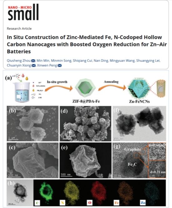 近日,本課題組周秋生副教授在設計高性能雙功能氧電催化劑并應用于可充電鋅-空氣電池方面取得重要進展,相關成果以“In Situ construction of zinc-mediated Fe, N-codoped hollow carbon nanocages with boosted oxygen reduction for Zn air batteries”為題發表在Small期刊(文章鏈接:https://doi.org/10.1002/smll.202307943)。本文通過熱解表面聚合鐵摻雜聚多巴胺ZIF-8多面體,合成了鋅誘導的Fe, N共摻雜碳納米籠(Zn-FeNCNs)。理論計算和實驗結果均表明,多面體與聚多巴胺之間的強相互作用促進了高活性鋅調制的FeNx位點的演化和電子傳遞,從而提高了氧析反應(OER)和氧還原反應(ORR)的雙功能催化活性。此外,當將該催化劑應用于固態電池時,該器件在不同彎曲角度下表現出優異的機械穩定性和較高的往返效率。