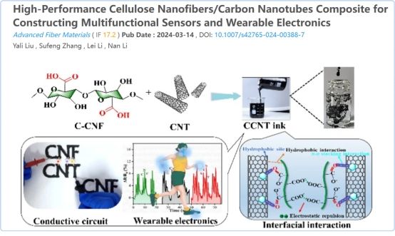 本課題組研究了一種由羧化纖維素納米纖維(C-CNFs)介導的水性碳納米管分散方法。利用CNFs的成膜特性和CCNT的面內定向自組裝特性,制備出具有高導電性(67 S cm?1)和高力學性能(抗拉強度為153 MPa)的復合自支撐膜。此外,所得的生物基CCNT油墨與各種印刷工藝兼容,并適應各種承印物。相關研究成果以“High-performance cellulose nanofibers/carbon nanotubes composite for constructing multifunctional sensors and wearable electronics”為題發表在國際期刊Advanced Fiber Materials(文章鏈接:https://doi.org/10.1007/s42765-024-00388-7)。