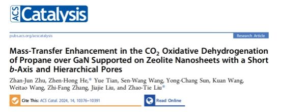 CO2氧化丙烷脫氫反應(yīng)(CO2-ODHP)不僅能生產(chǎn)大量丙烯,還能實現(xiàn)CO2減排和資源化回收,具有非常重要的意義。然而,該反應(yīng)在高溫條件下(>500 ℃)進行,催化劑積碳是導(dǎo)致其失活的重要因素,也是高溫催化反應(yīng)中面臨的常見難題之一。圍繞該問題,課題組開發(fā)出具有微孔、中孔和大孔的片狀分子篩,并負(fù)載GaN制備出具有多級孔納米片結(jié)構(gòu)特征的GaN/HNS-1催化劑,能夠高效催化CO2-ODHP反應(yīng)進行,同時能夠顯著降低失活速率。DFT理論計算和原位DRIFTS證實,該反應(yīng)涉及直接脫氫(DHP)和逆水煤氣變換反應(yīng)(RWGS),尤其是采用的多級孔片層分子篩催化劑能夠顯著增加氣體分子傳質(zhì)擴散效率,促進積碳前驅(qū)體的快速轉(zhuǎn)移,從而顯著提高催化性能。相關(guān)研究工作以“Mass-transfer enhancement in the CO2 oxidative dehydrogenation of propane over GaN supported on zeolite nanosheets with a short b-axis and hierarchical pores”為題發(fā)表在催化領(lǐng)域國際著名期刊ACS Catalysis(影響因子IF=11.7)上。我校碩士研究生朱占軍為第一作者,何珍紅教授和劉昭鐵教授為共同通訊作者,陜西科技大學(xué)為第一通訊單位,陜西師范大學(xué)為共同通訊單位。