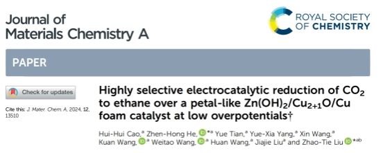 此外,開發(fā)了一種構(gòu)建Cu2+1O電催化劑的策略,通過Zn(OH)2穩(wěn)定Cu2+1O,在泡沫銅上形成片狀結(jié)構(gòu)的Zn(OH)2/Cu2+1O催化劑,實現(xiàn)電催化CO2還原為C2H6在低過電位下(-0.3?-0.6V (vs. RHE))產(chǎn)生較高的法拉第效率(在-0.3V下,產(chǎn)生C2H6的法拉第效率高達67.8%),且該催化劑可以連續(xù)應(yīng)用至少三天,具有可接受的電催化性能。相關(guān)研究工作以“Highly selective catalytic reduction of CO2 to ethane over a petal-like Zn(OH)2/Cu2+1O/Cu foam catalyst at low overpotentials”為題發(fā)表在Journal of Materials Chemistry A(IF=10.8)期刊上,該研究對電催化CO2還原產(chǎn)生C2H6提供了一種新的策略。我校博士研究生郭攀攀、曹會會為第一作者,何珍紅教授和劉昭鐵教授為共同通訊作者,陜西科技大學(xué)為第一通訊單位,陜西師范大學(xué)為共同通訊單位。