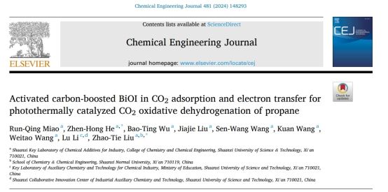 此外,為了降低CO2-ODHP反應(yīng)溫度,該團隊開發(fā)出Pt-GaN/SrTiO3和BiOI/AC催化劑,利用光和熱的協(xié)同優(yōu)勢,在相對較低的溫度下(300 °C)實現(xiàn)該反應(yīng),首次報道了Pt-GaN/SrTiO3光熱催化CO2氧化丙烷脫氫反應(yīng),揭示出GaN和Pt分別為C-H和C=O的活化中心;同時表明CO2在光熱和熱的條件下有不同的轉(zhuǎn)化路徑;揭示了反應(yīng)機理是丙烷直接脫氫耦合逆水煤氣反應(yīng)。相關(guān)工作分別以“Photothermal catalytic CO2 oxidative dehydrogenation of propane over a dual functional Pt-GaN/SrTiO3 catalyst”和“Activated carbon-boosted BiOI in CO2 adsorption and electron transfer for photothermally catalyzed CO2 oxidative dehydrogenation of propane”為題在Applied Catalysis B: Environment and Energy(IF=20.3)和Chemical Engineering Journal(IF=13.4)期刊上發(fā)表。論文均以陜西科技大學(xué)為第一通訊單位,博士研究生王森望和碩士研究生苗潤青分別為論文的第一作者,何珍紅教授和劉昭鐵教授為通訊作者。