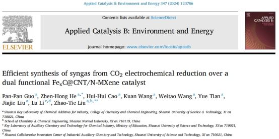圍繞CO2資源利用,采用熱解法制備了FexC@CNT/N-MXene催化劑,用于催化二氧化碳和水共電解生成CO和H2。通過調(diào)節(jié)外加電位,產(chǎn)生具有不同H2/CO摩爾比的合成氣,其中在-1.1 V (vs. RHE)獲得等量的CO和H2,可直接用于氫甲酰化和FT合成等反應(yīng)。表征結(jié)果表明,在制備過程中形成了FexC、碳納米管和摻雜N的MXene。本研究為CO2ER和HER共電解合成氣提供了一種高效的催化劑,該策略對設(shè)計其他偶聯(lián)反應(yīng)的雙功能催化劑提供思路。相關(guān)研究工作以“Efficient synthesis of syngas from CO2 electrochemical reduction over a dual functional FexC@CNT/N-MXene catalyst”為題,發(fā)表在Applied Catalysis B: Environment and Energy(IF=20.3)。
