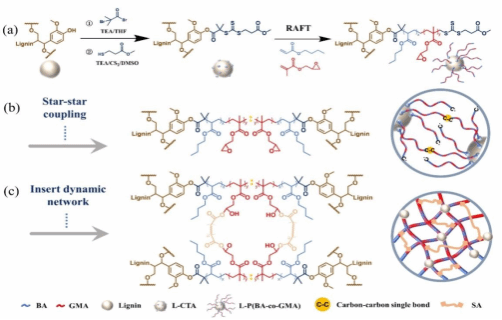 薛白亮教授等利用五/六元環(huán)碳酸酯反應(yīng)特點(diǎn),提出了具有動(dòng)態(tài)交聯(lián)結(jié)構(gòu)的新型木質(zhì)素基非異氰酸酯聚氨酯合成路線。基于星型木質(zhì)素接枝共聚物的可控合成,利用核-核副反應(yīng)與動(dòng)態(tài)化學(xué)策略,構(gòu)建了木質(zhì)素基動(dòng)態(tài)雙網(wǎng)絡(luò)結(jié)構(gòu),探究了其在膠黏劑和可降解塑料等領(lǐng)域的應(yīng)用。該研究發(fā)表于Polymer Chemistry等國際期刊。