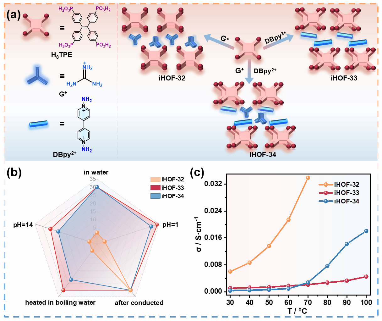 本工作中,通過多組分電荷輔助氫鍵自組裝策略,以鹽酸胍(G?HCl)、1,1?-二氨基-4,4?-聯吡啶二碘化合物(DBpy?2I)和1,1,2,2-四(4-膦酰基苯基)乙烯(H8TPE)為原料成功設計合成了兩種雙組分iHOFs(iHOF-32,iHOF-33)和一種三組分iHOF(iHOF-34)。其中,富含N和H且鏈長較短的G?HCl增強了iHOFs的氫鍵網絡,有助于質子的有效遷移。DBpy?2I剛性結構為iHOFs提供了額外的支撐。iHOF-34結合了iHOF-32和iHOF-33的優勢。通過組分間協同作用,不僅在強酸堿環境中保持穩定性,還達到1.81 × 10?2 S·cm?1的高質子電導率。此外,制備的9%-iHOF-34/Nafion復合膜的質子電導率峰值為1.55 × 10?1 S·cm?1。在直接甲醇燃料電池中,峰值功率密度達到80.78 mW·cm?2,是重鑄Nafion膜的1.6倍。該研究通過精心設計的自組裝策略,實現了對iHOFs結構和功能的精細調控。