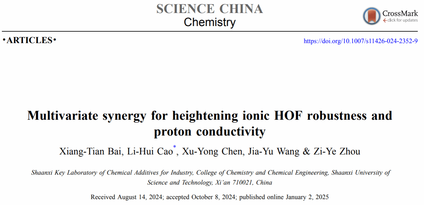 相關成果以“Multivariate Synergy for Heighten Ionic HOF Robustness and Proton Conductivity”為題,發表在Science China Chemistry(IF = 10.4)上。陜西科技大學為唯一通訊單位,化學與化工學院2022級博士研究生白向田為論文的第一作者,曹麗慧教授為唯一通訊作者。