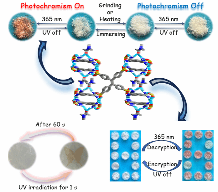 相關成果以“A solvent-controlled photoresponsive ionic hydrogen-bonded organic framework for encryption applications”為題,發表在Chemical Communications上(IF = 4.3,自然指數期刊)上。陜西科技大學為唯一通訊單位,化學與化工學院2021級碩士研究生黃明峰為論文的第一作者,曹麗慧教授為唯一通訊作者。