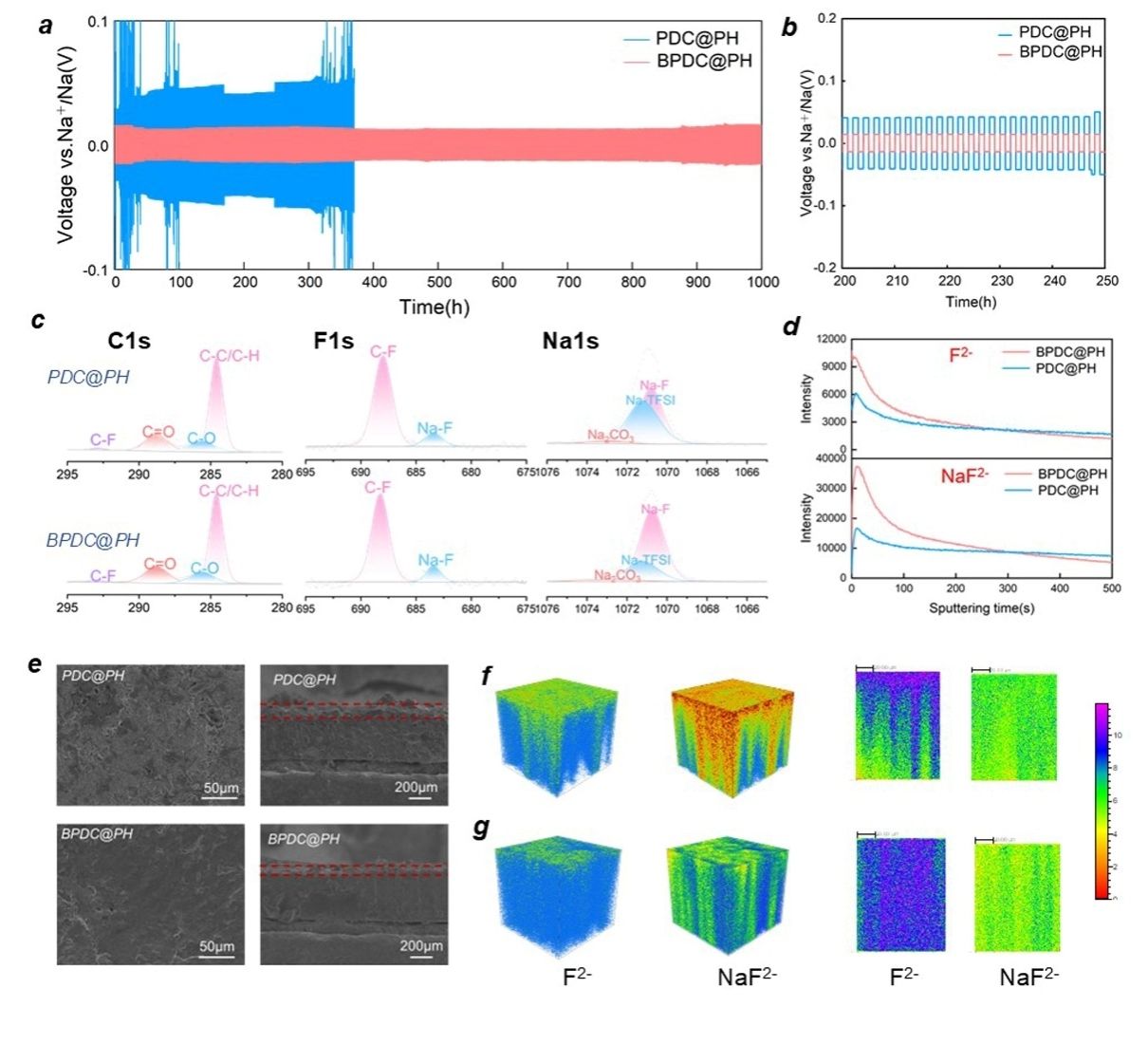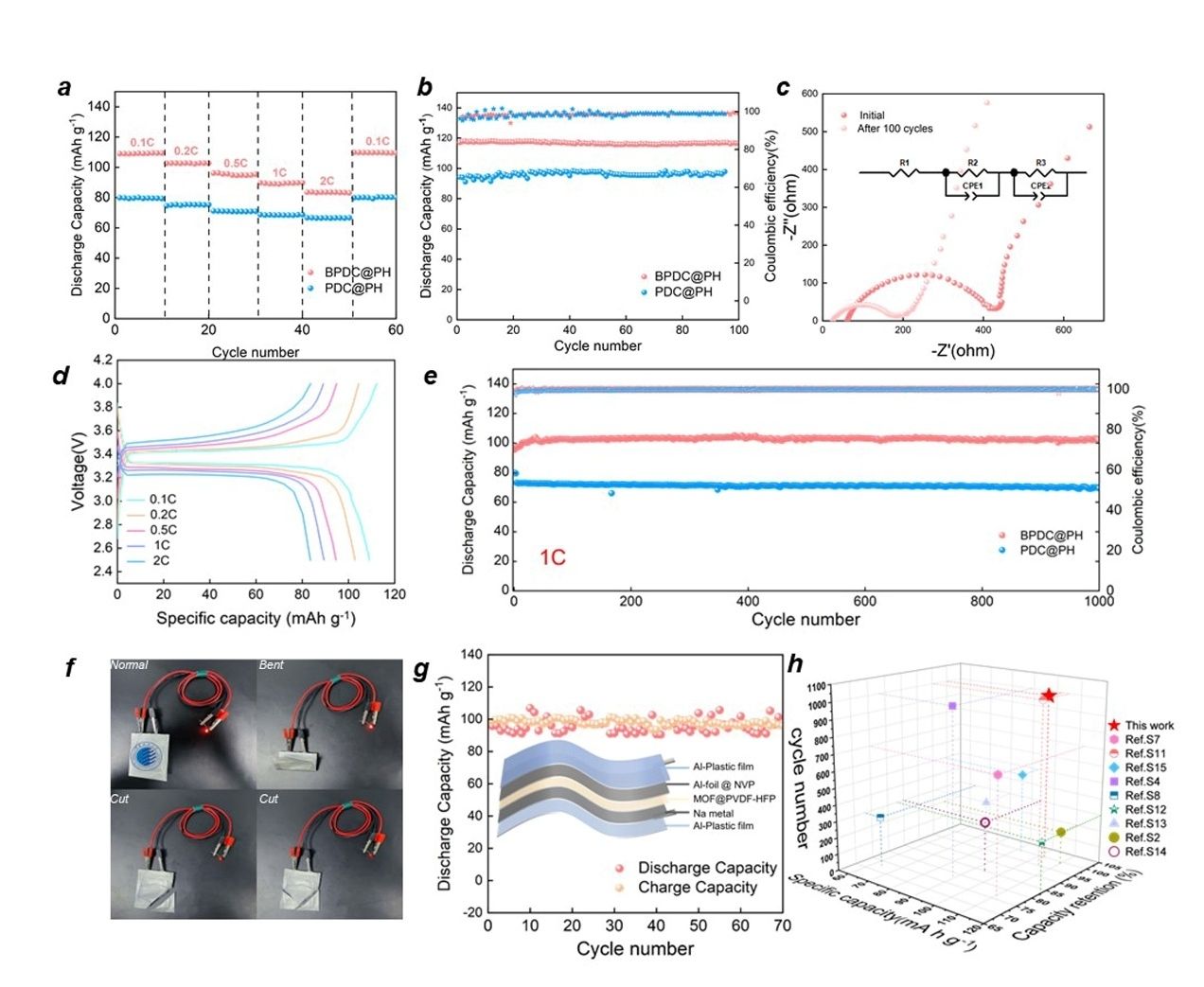 2. 超長循環穩定性與界面優化。在1.0 mA cm?2電流密度下,鈉金屬對稱電池連續運行超1000小時無短路,全電池(NVP|BPDC@PH|Na)循環1000次后容量保持率高達98%。分子動力學模擬顯示,擴大的MOF孔道加速了NaTFSI的傳輸,促進負極表面形成富含NaF的薄層固態電解質界面(SEI),有效抑制枝晶生長。組裝的固態軟包電池在彎折、切割等極端條件下仍可穩定供電,并點亮LED燈組,展現出優異的機械安全性和商業化潛力。