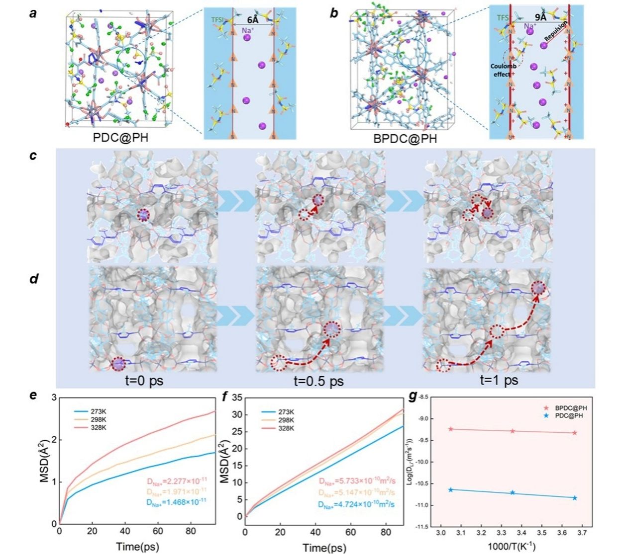 1. 精準設計MOF孔道,實現離子高效傳輸。通過調控配體長度形成孔徑分別為6 ?和9 ?的一維通道。其中,BPDC@PH電解質憑借更大的孔道(9 ?)及孔壁靜電吸附特性,顯著優化了鈉離子(Na?)擴散路徑,并選擇性吸附陰離子(TFSI?),使離子遷移數提升至0.87,電導率達7.74 × 10?? S cm?1(35°C)。