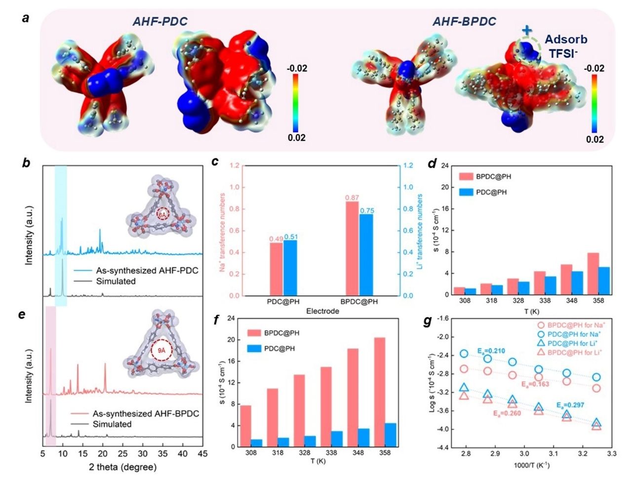 針對上述問題,近日,陜西科技大學化學與化工學院黃文歡教授團隊設計出兩種鋅基MOF材料(AHF-PDC與AHF-BPDC),通過調控配體長度形成孔徑分別為6 ?和9 ?的一維通道。其中,BPDC@PH電解質憑借更大的孔道(9 ?)及孔壁靜電吸附特性,顯著優化了鈉離子(Na?)的擴散路徑。同時,該材料能夠選擇性吸附陰離子(TFSI?),從而將離子遷移數提升至0.87,并在35°C下實現了7.74 × 10?? S cm?1的高電導率。這一研究為開發高性能鈉金屬電池電解質提供了重要的理論依據和實驗支持。相關工作在《Advanced Functional Materials》期刊上以“Enhanced Ionic Diffusion via Refined Pillared 1D Channels for Sodium Metal Batteries”為題發表。