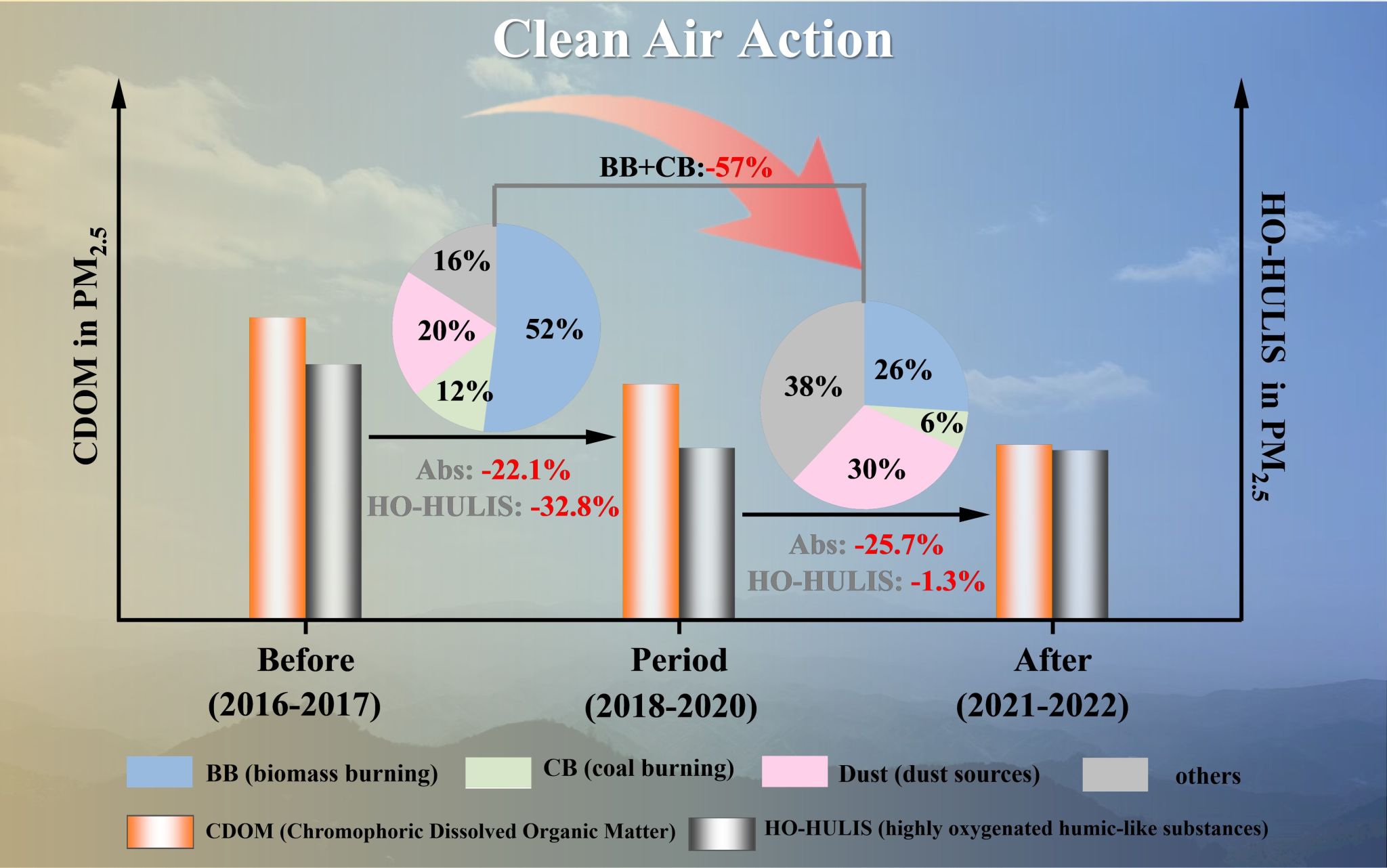 我國頒布實施的《打贏藍天保衛戰三年行動計劃》不僅是一項旨在改善十幾億人民呼吸健康的重大工程,也是應對全球環境治理的重大舉措。自大氣污染治理行動開展以來,我國空氣質量得到了顯著改善,但也呈現出“越治理越難治理”的瓶頸。為了更加精準的服務未來大氣污染治理,陳慶彩教授團隊以西安市為例,從新污染物—棕碳的角度綜合評估了過去數年間大氣污染治理對空氣質量改善的程度和作用規律,剖析了當前存在的關鍵問題并對進一步大氣污染治理提出了對策建議。研究證實了《打贏藍天保衛戰三年行動計劃》系列措施可以有效協同傳統污染物與新污染物的治理,對西安地區空氣質量和環境健康具有顯著的積極效應。然而,研究也指出當前對揚塵源和二次有機氣溶膠的控制仍然有限,同時區域聯防聯控的效果也有待進一步加強。此外,團隊還發現了有趣的現象,隨著清潔空氣政策的實施,顆粒物濃度顯著下降,但潛在毒性組分卻出現了矛盾性的上升。這對以健康為導向的空氣污染治理提出了新的挑戰,未來大氣污染治理應將重點從控制污染物濃度轉變為健康風險物質的精準控制,從而獲得健康效益。