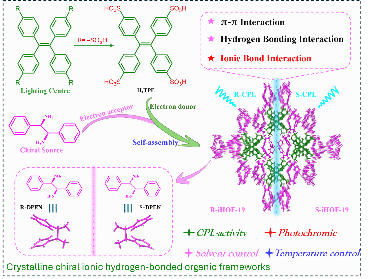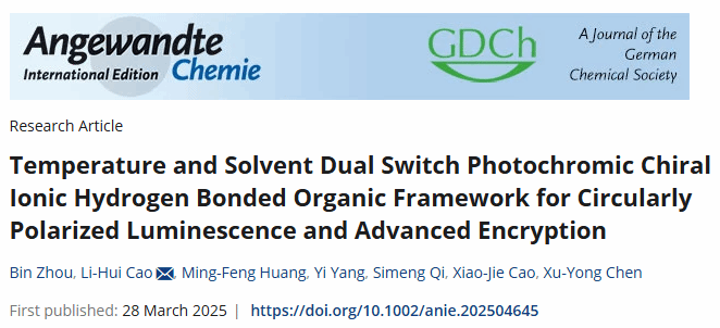 近日,我校化工學院曹麗慧教授團隊通過離子型氫鍵有機框架(iHOFs)具有豐富的氫鍵受體和多樣性的結構框架特性;利用它(分子共軛、質子化效應、電荷轉移和可逆結構轉變)不同的光衰減路徑,設計得到了R/S-iHOF-19多功能的光學功能集合體。另外,氫鍵的鍵能要低于共價鍵的鍵能,更容易實現局部位點的斷鍵和二次成鍵,達到對材料性能的進一步精準調控。實現了刺激響應型低溫光致變色、熒光、圓偏振發光等多種光學功能集成的晶態手性框架構筑。并且探索了R/S-iHOF-19未來在多重高級加密防偽方面的潛在應用。這項工作代表了為數不多的低溫刺激響應型晶態手性超分子自組裝材料的系統研究,也表明了離子型氫鍵有機框架(iHOF)可以作為一個新的材料設計策略,為新材料的設計、開發、探索提供可參考的研究模型。相關工作在《Angew. Chem. Int. Ed》期刊上以“Temperature and Solvent Dual Switch Photochromic Chiral lonic Hydrogen-Bonded Organic Framework for circularly Polarized Luminescence and Advanced Encryption”為題發表,陜西科技大學為唯一通訊單位,化學與化工學院2024級博士研究生周斌為論文的第一作者,曹麗慧教授為唯一通訊作者。
