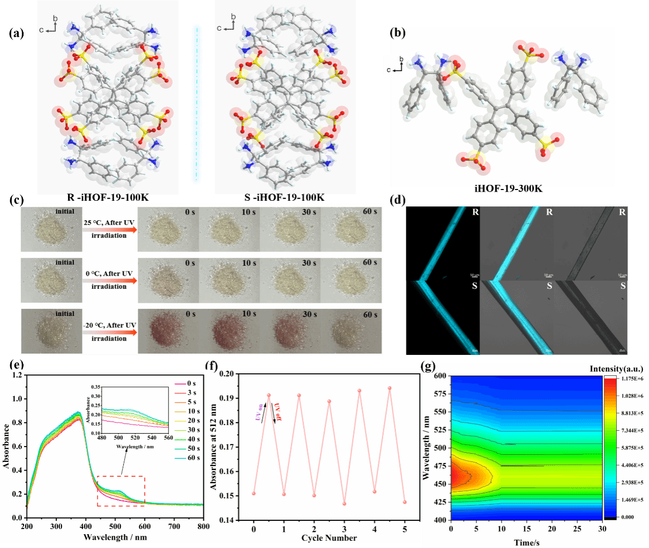 (1). R/S-iHOF-19充分發揮其結構靈活性和氫鍵的動態特性,實現材料性能的精準調控。通過調控結構框架中的溶劑(水和甲醇)分子的得失可以控制光致變色的開關。實現了具有溫度、溶劑雙重控制的智能響應光致變色材料的探索和合成。