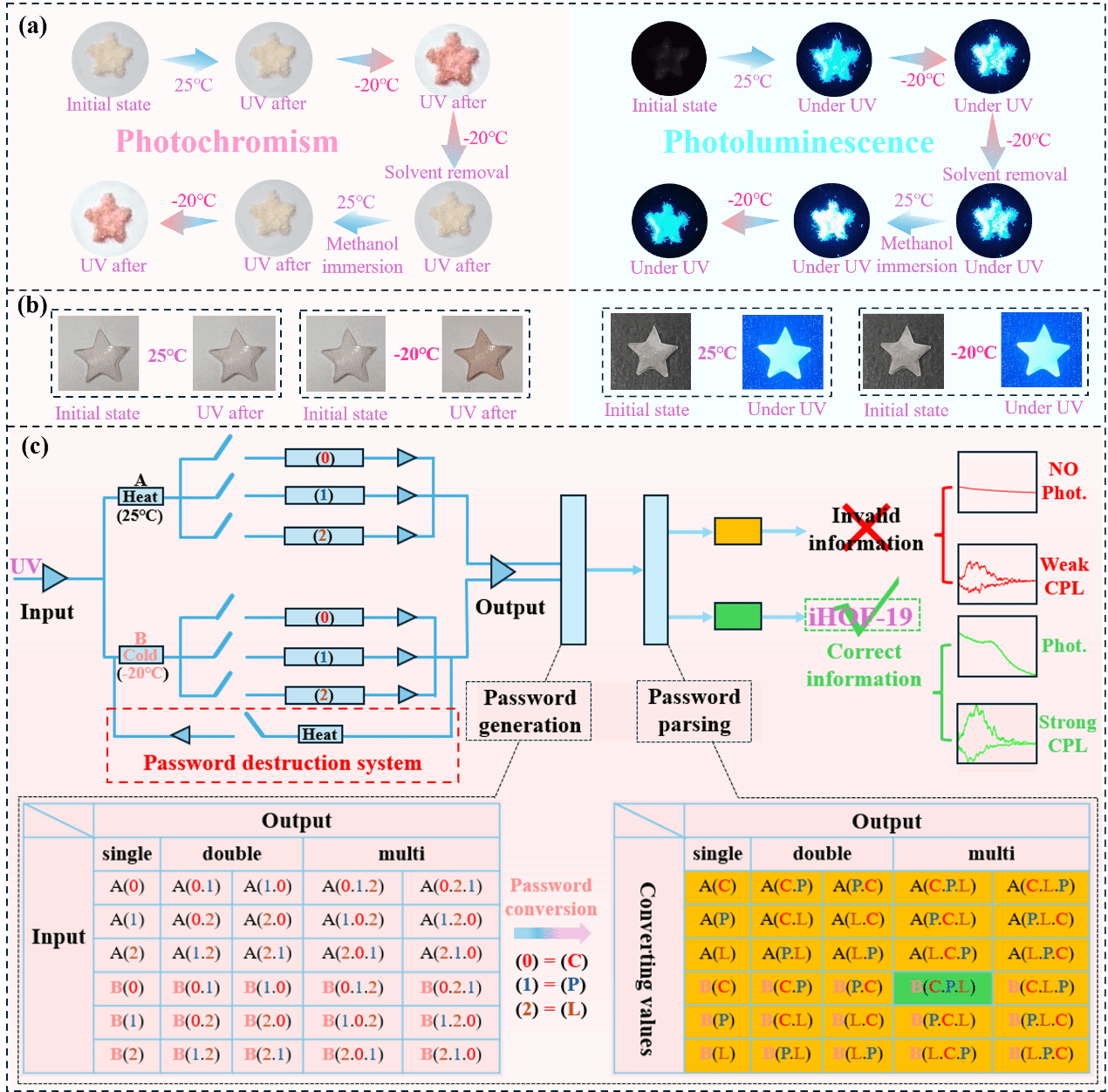 光致變色信息加密材料是依賴于外部刺激(光、溫度、壓力、pH等)發生可逆顏色/形態變化的功能化響應性材料,其被認為是未來多重高級加密防偽方面最具有潛力的智能材料候選者之一。但是將低溫作為響應刺激源開啟光致變色并且與圓偏振發光有機融合的固態多功能加密材料少有文獻報道。低溫刺激相比于室溫或者高溫刺激來說更為苛刻,解密難度要更大,這是一把更優的鑰匙選擇。信息解密要在特定的設備下或者場所才能滿足刺激響應的需求,從而打開信息解密的安全鎖。由于光致變色加密材料在極端低溫條件下會抑制基態(S0)電子躍遷到激發態(S1)。這需要加密材料在極低的溫度依然具有一定的電子激發為光致變色提供所需的能量供應。另外,還要有穩定的低溫自由基激發和超分子手性網絡兩者共同來實現穩定的顯色性和圓偏振性。因此,將低溫刺激響應的光致變色和圓偏振發光有機融合構筑多功能固態雙重信息加密材料仍是目前的研究難點。