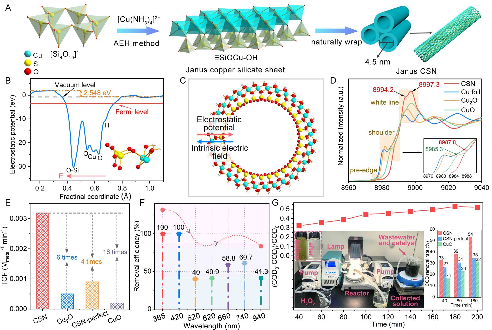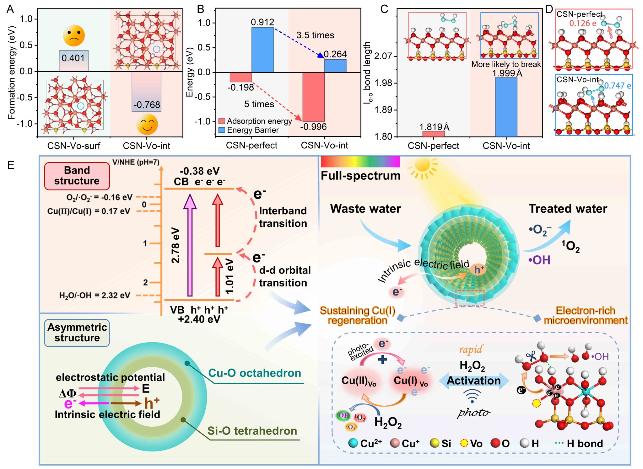 為了克服上述挑戰(zhàn),陜西科技大學(xué)王蘭教授團隊提出了一種非對稱結(jié)構(gòu)設(shè)計策略,構(gòu)建了Janus硅酸銅納米管(CSN)并誘導(dǎo)產(chǎn)生了富電子Cu(Ⅰ)和氧空位缺陷(Vo)位點,實現(xiàn)了有效的全光譜驅(qū)動光芬頓催化。該研究發(fā)現(xiàn),Vo和CuO6八面體結(jié)構(gòu)的共存使得CSN獲得了優(yōu)異的全光譜光響應(yīng)能力;不對稱結(jié)構(gòu)所產(chǎn)生的固有內(nèi)建電場極大地促進了光生載流子的空間分離和光生電子的定向轉(zhuǎn)移;Cu(Ⅰ)位點附近的Vo充當電子陷阱位點,將光生電子富集到其鄰近的Cu位點,加速了Cu(Ⅱ)/Cu(Ⅰ)的氧化還原循環(huán),這充分利用了光激發(fā)電子“自我補充”來補償Cu(Ⅰ)位點的給電子能力并實現(xiàn)了H2O2的持續(xù)活化。