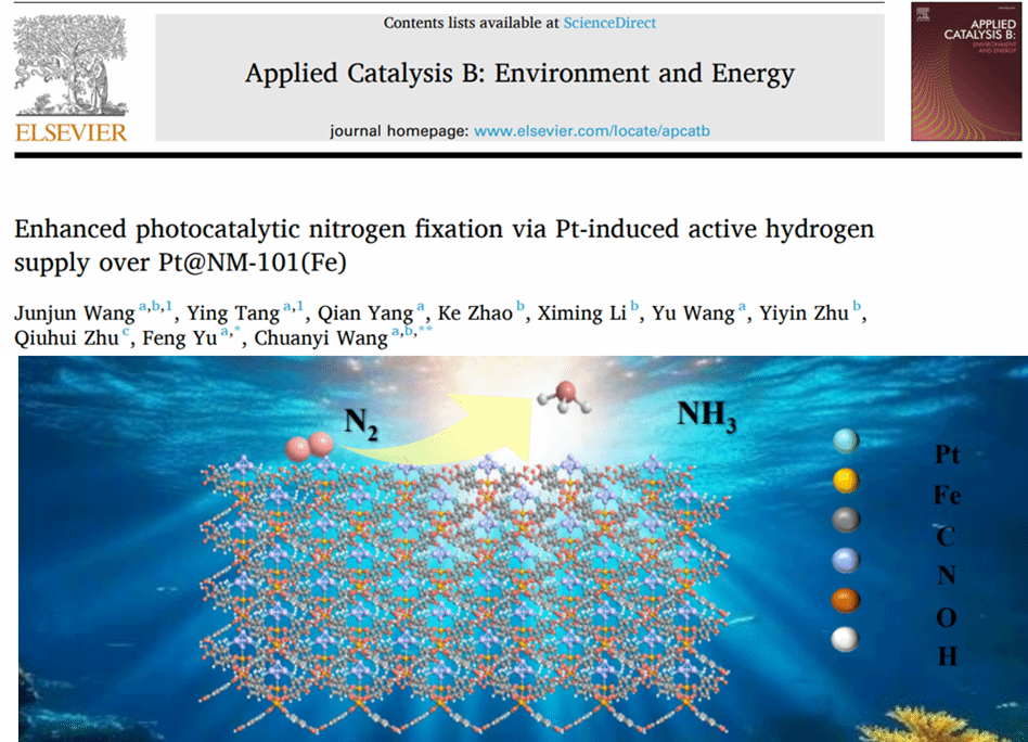 相關成果以“Enhanced photocatalytic nitrogen fixation via Pt-induced active hydrogen supply over Pt@NM-101(Fe)”為題,發表在Applied Catalysis B: Environment and Energy(IF = 20.2)上。陜西科技大學為論文通訊單位之一,環境學院2022級聯培碩士研究生王俊俊(石河子大學)為該論文的第一作者,環境學院王傳義教授為論文通訊作者。