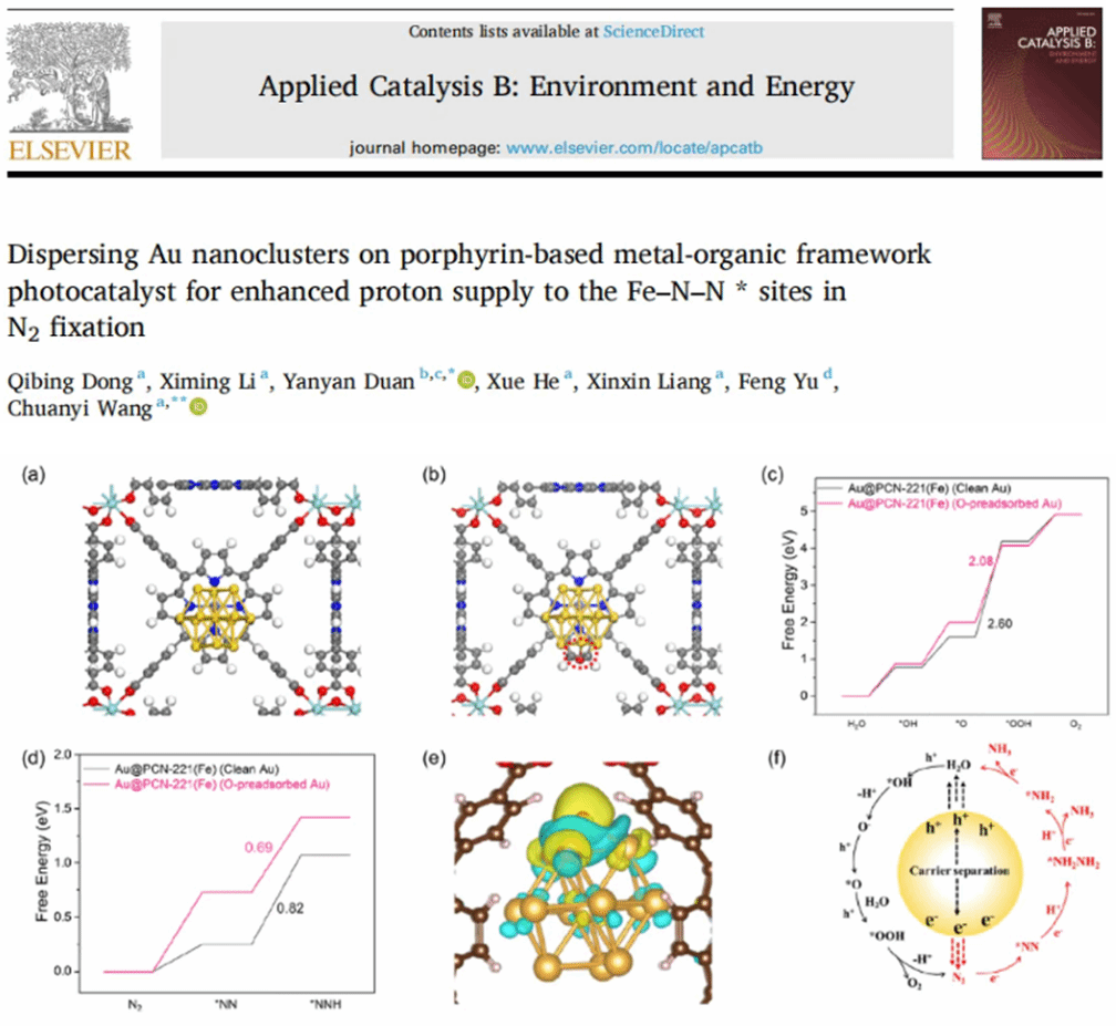 相關成果以“Dispersing Au nanoclusters on porphyrin-based metal-organic framework photocatalyst for enhanced proton supply to the Fe–N–N*?sites in N2 fixation”為題,發表在Applied Catalysis B: Environment and Energy(IF = 20.2)上。陜西科技大學為論文第一通訊單位,環境學院2021級博士研究生董奇兵為該論文的第一作者,環境學院王傳義教授為論文通訊作者。