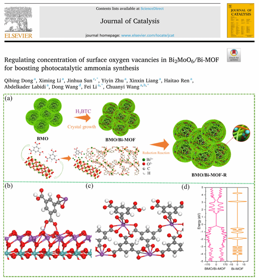 系列成果四:表面氧空位(OVs)工程作為提升光催化性能的有效策略已被廣泛采用。然而,目前能夠精準調控表面OVs濃度并闡明其對固氮活性影響機制的光催化體系仍較為匱乏。本研究以Bi2MoO6(BMO)為基底,通過在其表面負載鉍基金屬有機框架(Bi-MOF)構建可操作平臺,利用Bi-MOF組分中鉍離子的還原特性實現OVs濃度的精準調控。