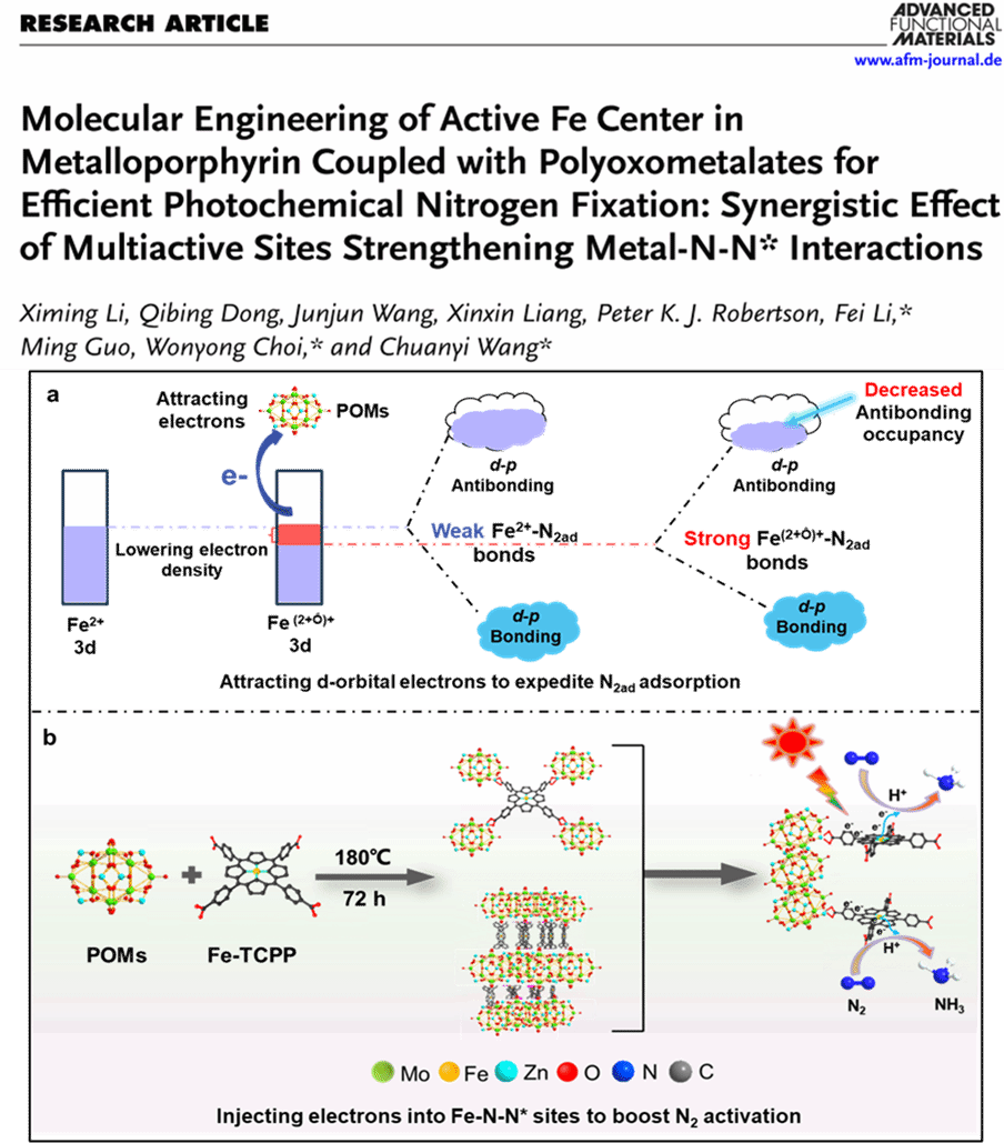 相關成果以“Molecular engineering of active Fe center in metalloporphyrin coupled with polyoxometalates for efficient photochemical nitrogen fixation: Synergistic effect of multiactive sites strengthening metal-N-N* interactions”為題,發表在Advanced Functional Materials(IF = 18.5)上。陜西科技大學為論文第一通訊單位,環境學院2021級博士研究生李喜明為該論文的第一作者,環境學院王傳義教授為論文通訊作者。