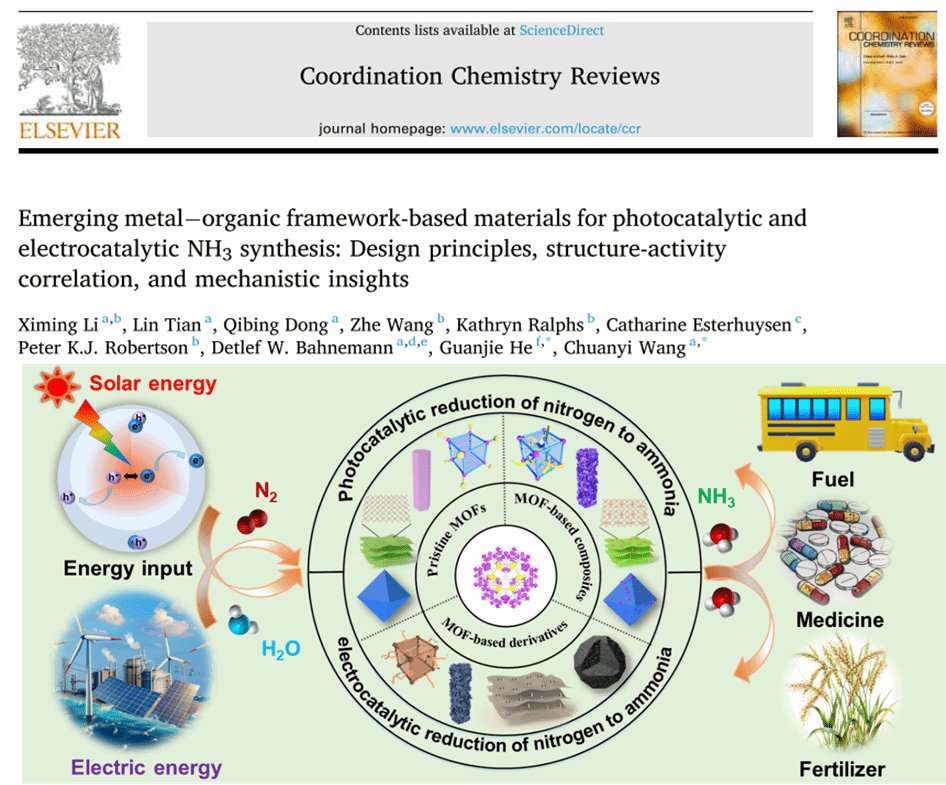 相關成果以“Emerging metal?organic framework-based materials for photocatalytic and electrocatalytic NH3 synthesis: Design principles, structure-activity correlation, and mechanistic insights”為題,發表在Coordination Chemistry Reviews(IF = 20.3)上。陜西科技大學為論文第一通訊單位,論文第一作者為環境學院2021級博士研究生李喜明,環境學院王傳義教授為論文通訊作者。