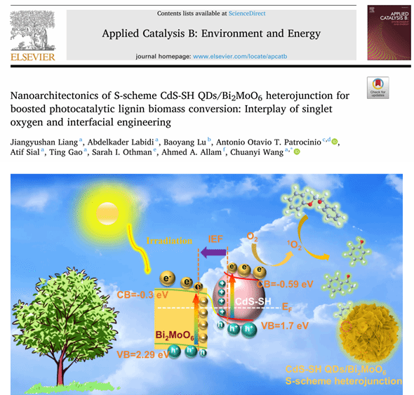 木質素作為自然界中唯一的可再生芳香族資源,其高效轉化一直是生物質利用領域的研究熱點,但Cβ-O鍵的高穩定性制約轉化效率。基于此,我校王傳義教授團隊開發了一種S-構型異質結的光催化劑(CdS-SH QDs/Bi2MoO6),通過界面Bi-S鍵增強載流子分離,激活單線態氧(1O2)精準攻擊木質素Cβ-O鍵,實現了木質素生物質的高效轉化。以PP-ol(2-苯氧基-1-苯基乙醇)為模型化合物,苯酚/苯乙酮產率達90%+;通過在自然環境下裂解從馬尾松提取的堿木質素的,香蘭素產量較單一催化劑提升70倍。該工作為設計能夠在實際環境中有效解聚木質素的光催化劑提供了新的視角。(原文鏈接:https://doi.org/10.1016/j.apcatb.2025.125092)